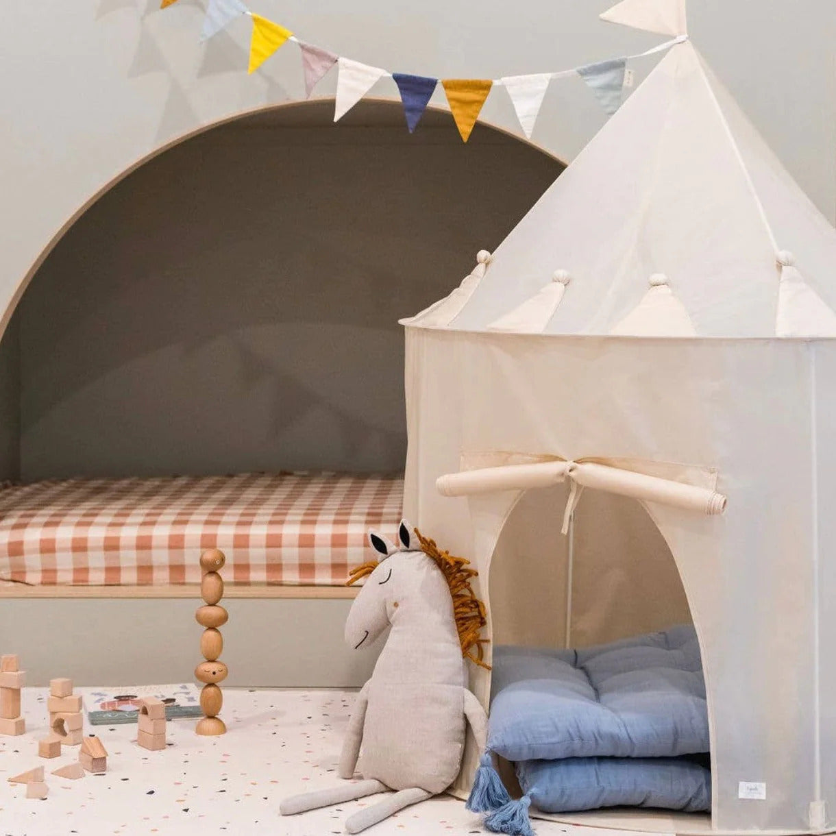 Entdecken Sie den perfekten Ort zum Spielen, Lesen, Entspannen und Ausruhen. Das Zelt schafft eine gemütliche und magische Umgebung, die Kinder lieben werden. Es ist eine besondere dekorative Ergänzung für das Kinderzimmer, die einen einzigartigen Charme und einen originellen Stil verleiht. Die Netzfenster und -türen können nach Belieben geöffnet und geschlossen werden. Das Zelt wurde sorgfältig entworfen, um Stabilität und Komfort während des Gebrauchs zu gewährleisten. Es verfügt über einen soliden Rahmen, der es in einer stabilen Position hält, selbst bei intensiver Nutzung. Dank seiner leichten Konstruktion lässt sich das Zelt leicht transportieren und an verschiedenen Orten aufstellen. Das Zelt wurde aus recyceltem Polyester hergestellt. Dieses Material fühlt sich angenehm an und ist gleichzeitig widerstandsfähig gegen den täglichen Gebrauch.
