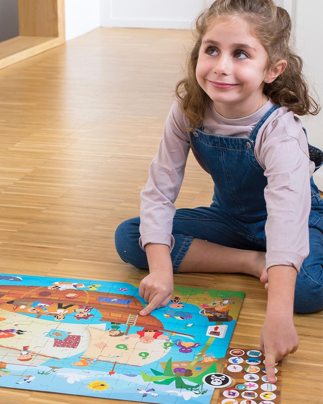 Das Apli Kids Beobachtungspuzzle ist ein hervorragendes Spielzeug für ältere Kinder. Es erfordert mehr Konzentration und Präzision beim Zusammensetzen und enthält kleinere Teile. Die Aufgabe des Kindes ist es, das Piratenschiff aus 104 Puzzleteilen zusammenzusetzen und dann die Gegenstände auf dem Puzzle zu finden (z. B. eine Schaufel, einen Fisch, einen Schatz), die sich auf den 3 im Set enthaltenen Karten befinden. Außerdem wurde ein Bildposter beigefügt, um die Benutzung zu erleichtern. Das Stapeln von Puzzles durch Kinder hat großen pädagogischen Wert. Während des Spiels, übt das Kleinkind Gedächtnis, Konzentration, entwickelt visuelle und räumliche Fähigkeiten. Verpackt in einem robusten Karton. Sie sind perfekt als Geschenk geeignet.