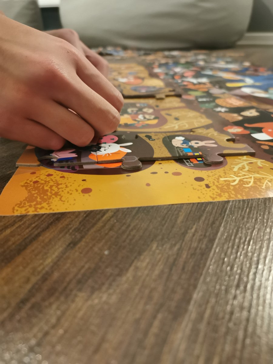 Das Apli Kids Beobachtungspuzzle ist ein hervorragendes Spielzeug für ältere Kinder. Es erfordert mehr Konzentration und Präzision beim Zusammensetzen und enthält kleinere Teile. Die Aufgabe des Kindes ist es, aus 104 Puzzleteilen einen Wald zusammenzusetzen und dann die Gegenstände auf dem Puzzle zu finden (z. B. ein Lagerfeuer, einen Korb, ein Eichhörnchen), die auf den 3 im Set enthaltenen Karten zu finden sind. Außerdem wurde ein Bildposter beigefügt, um die Benutzung zu erleichtern.