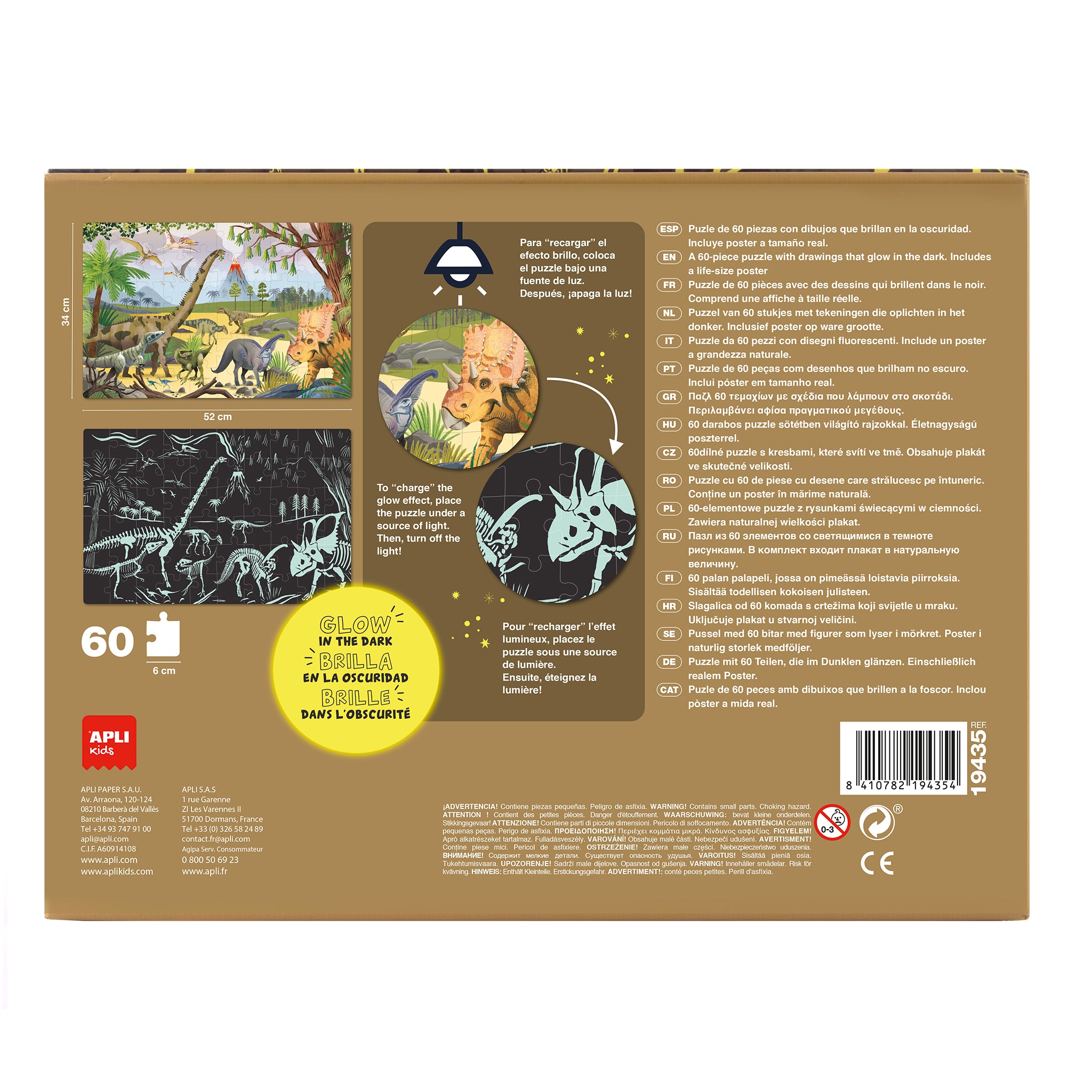 Die im Dunkeln leuchtenden Puzzles von Apli Kids sorgen für großen Spaß im Dunkeln! Sie bestehen aus 60 Teilen, die 6 x 6 cm groß sind. Nach dem Zusammenbau schalten Sie einfach das Licht aus, um die leuchtenden Dinosaurierskelette zu sehen! Aufmerksame Kleinkinder werden bemerken, dass sich das Bild leicht verändert, wenn es dunkel ist. Ein lebensgroßes Poster des Bildes ist enthalten, um das Stapeln zu erleichtern.