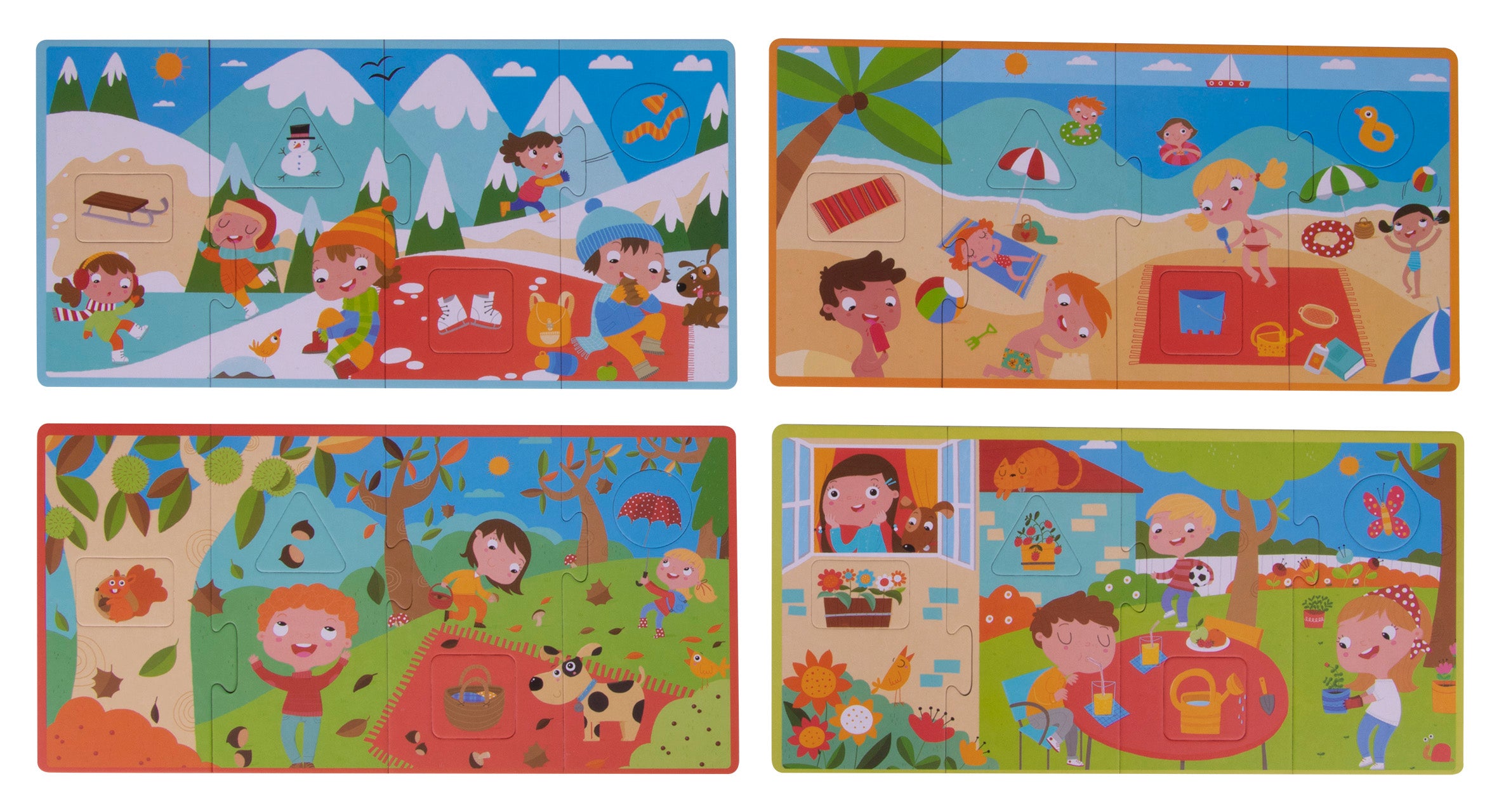 Set mit 4 Puzzles, bestehend aus 4 Puzzles in XL-Größe. Jedes Puzzle zeigt eine andere Jahreszeit – Frühling, Sommer, Herbst, Winter. Das Kind muss zusätzlich die für die jeweilige Jahreszeit typischen Elemente erkennen und zuordnen. Beim Spielen trainiert das Kind sein Gedächtnis, seine Konzentration und seine motorischen Fähigkeiten. Die großen Puzzles aus dickem Karton passen perfekt in kleine Hände. Die farbenfrohen, fröhlichen Motive laden zum Spielen ein. Ideal als Geschenk.