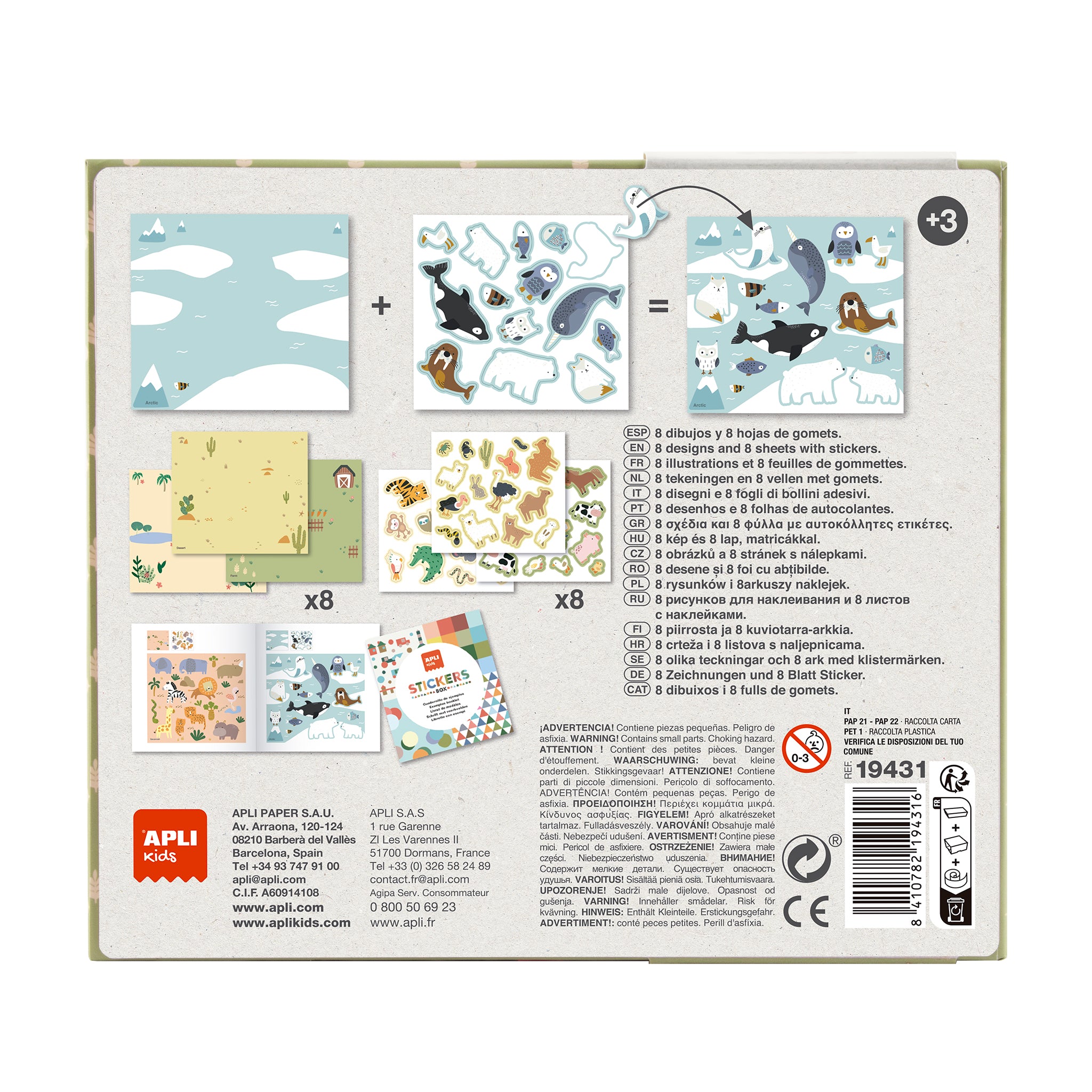 Set mit Aufklebern der Marke Apli Kids mit Grafiken, die Tiere und ihre natürliche Umgebung darstellen. Das Spiel besteht darin, die Blätter mit den passenden Aufklebern zu ergänzen, die zur abgebildeten Illustration passen. Bei einem Fehler kann das Kind den Aufkleber abziehen und an einer anderen Stelle wieder aufkleben.