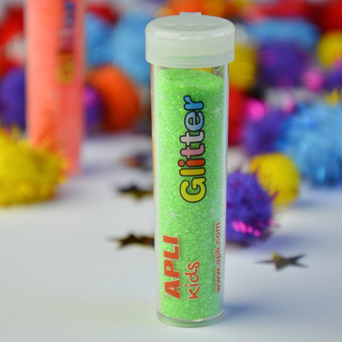 Mit Apli Kids wird sensorisches Spielen noch bunter und interessanter. Das Set enthält bunte Sterne und metallische Pompons in verschiedenen Größen, die durch orangefarbenen und grünen Glitzer perfekt ergänzt werden.