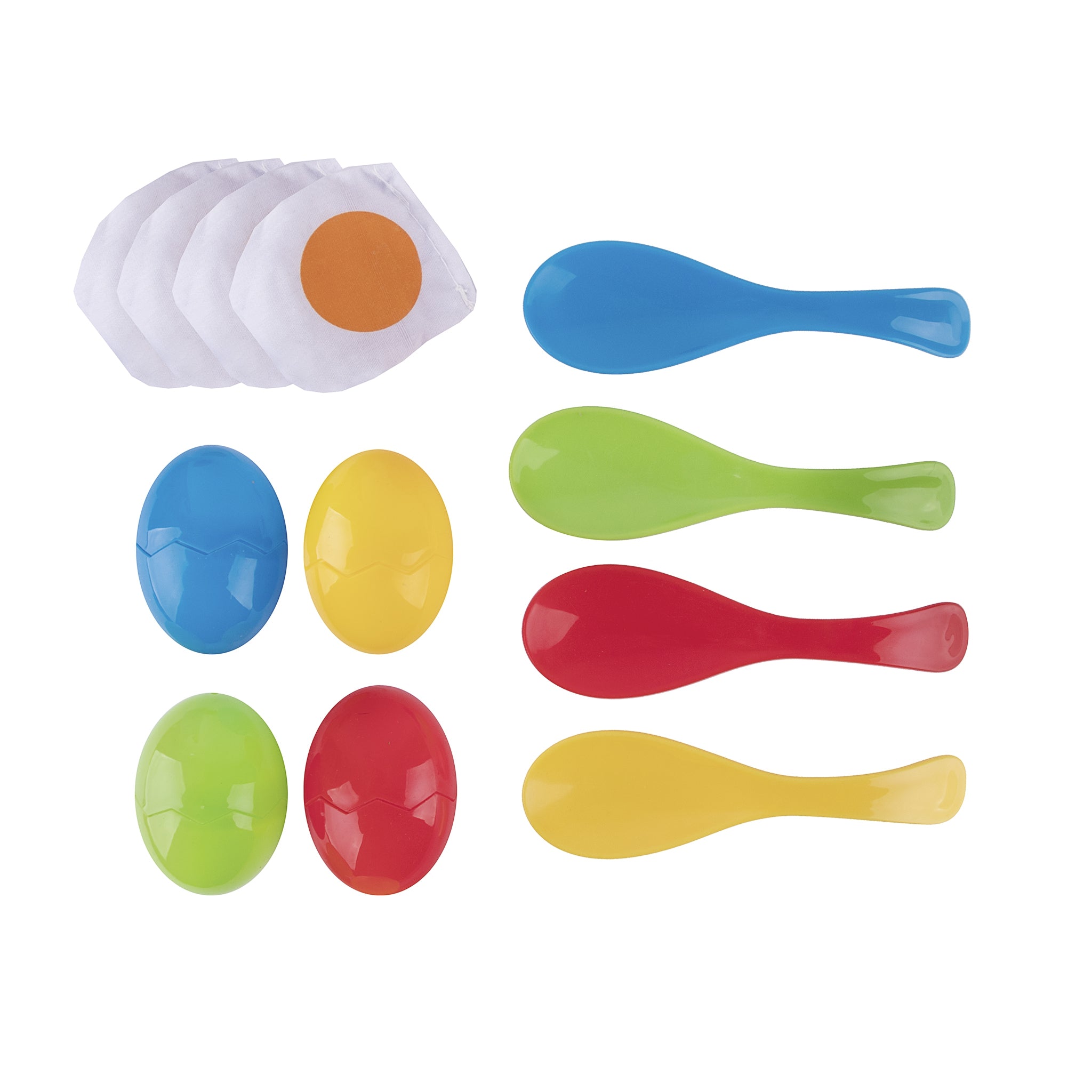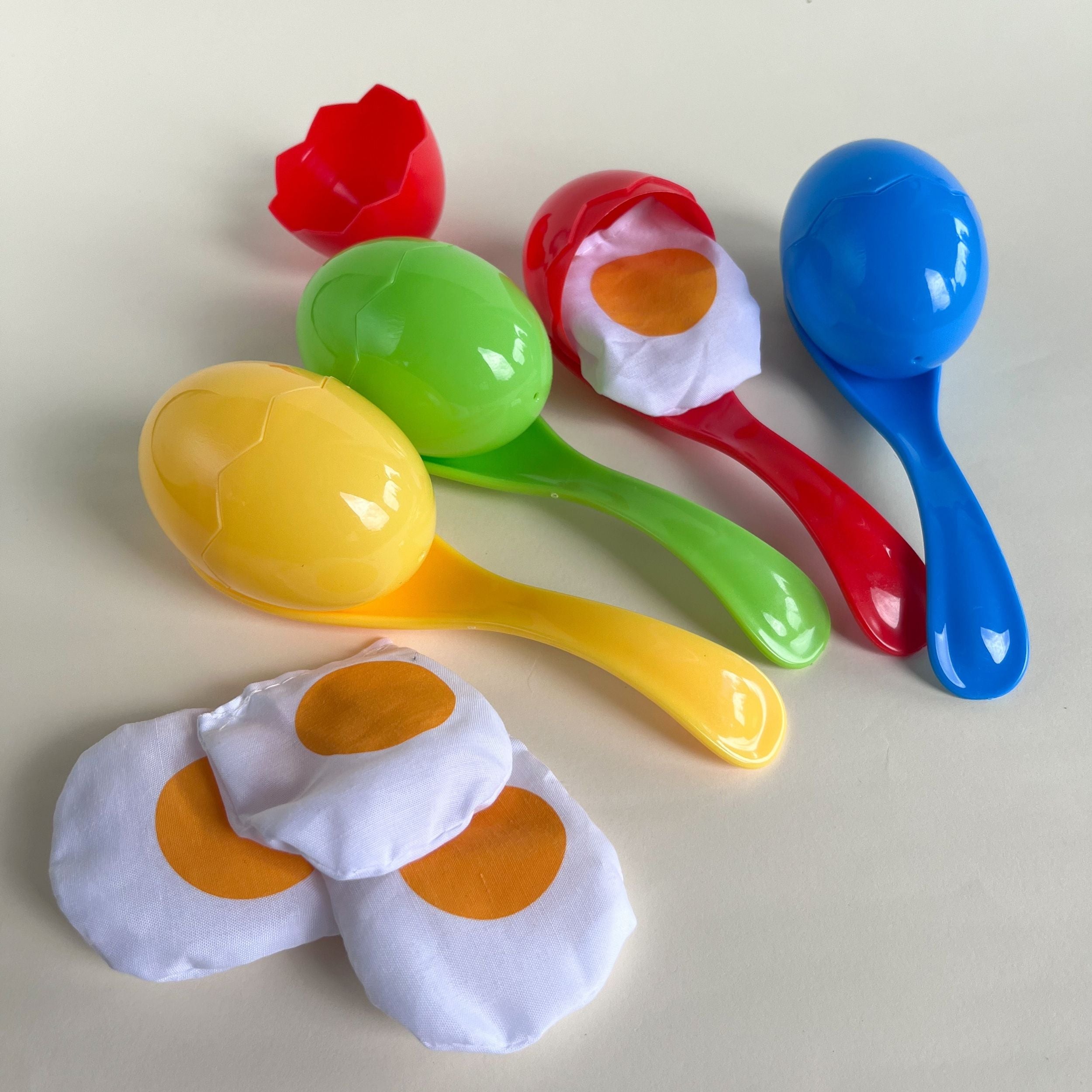 - Lieferumfang: 4 Eierschalen, 4 Stoff-Spiegeleier, 4 Löffel in verschiedenen Farben und 1 Aufbewahrungstasche