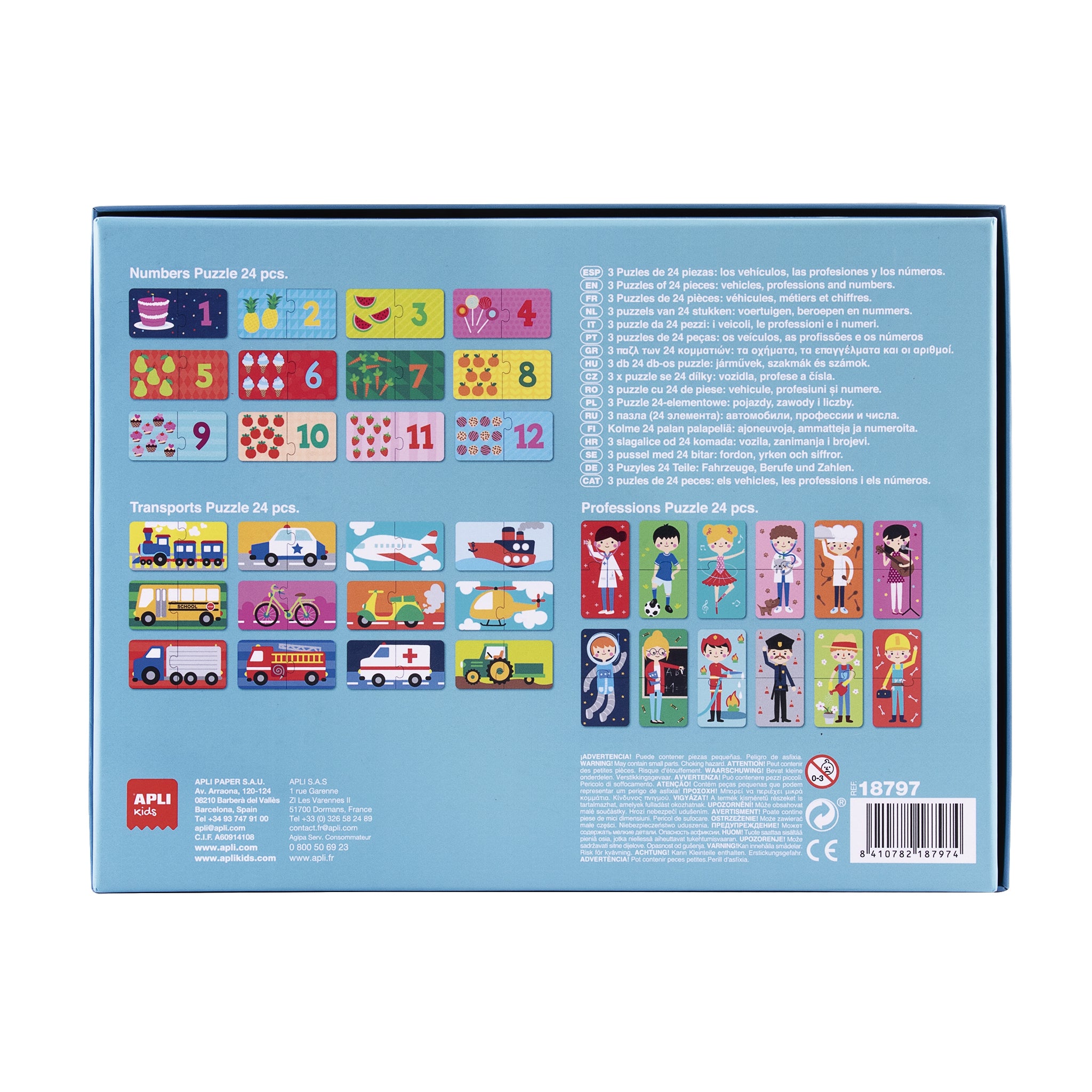Zweiteiliges Puzzleset von Apli Kids für Kinder ab 3 Jahren. Es besteht aus 3 Puzzlesets mit je 24 Teilen in der Größe 7 x 7 cm. Beim Spielen lernt das Kind Zahlen, Verkehrsmittel und Berufe kennen. Eine perfekte Kombination aus Lernen und Spaß. Das Set eignet sich hervorragend als Geschenk.