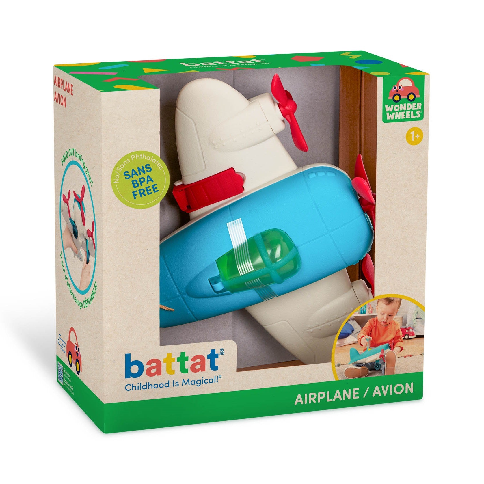 Flugzeug aus der Serie Wonder Wheels von Battat. Hergestellt aus sehr stabilem, handfreundlichem Kunststoff. Die rotierenden Propeller, die sich öffnende Cockpitklappe und die in das Fahrwerk einziehenden Räder sorgen für jede Menge Spaß.