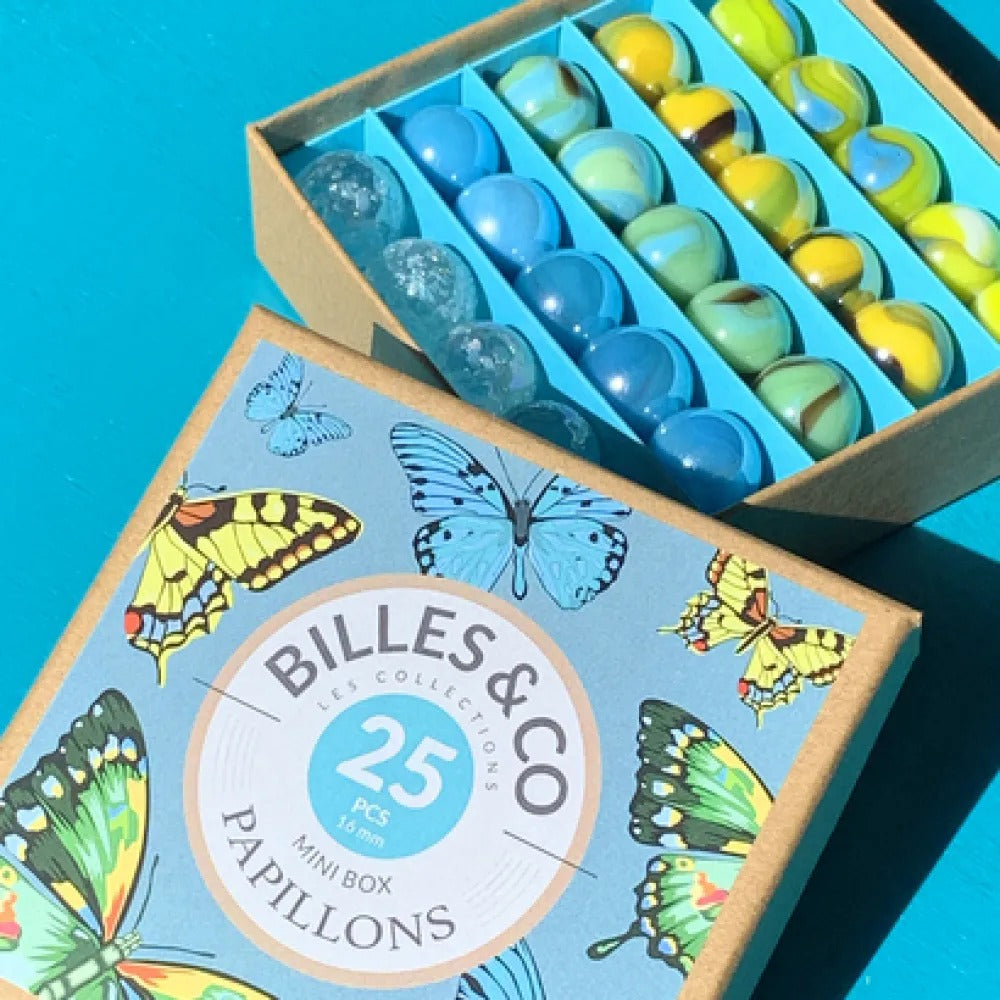 Billes & Co Blue Butterflies ist ein Set mit 25 Glaskugeln , die farbenfroh in einer schön dekorierten Schachtel angeordnet sind. Die verschiedenen Farben, Texturen und Muster der Kugeln haben eine hypnotisierende Kraft, die Sie nicht aus dem Konzept bringen wird. Die Kugeln sind thematisch angeordnet, so dass in kleinen Schachteln eine Art Universum entsteht.