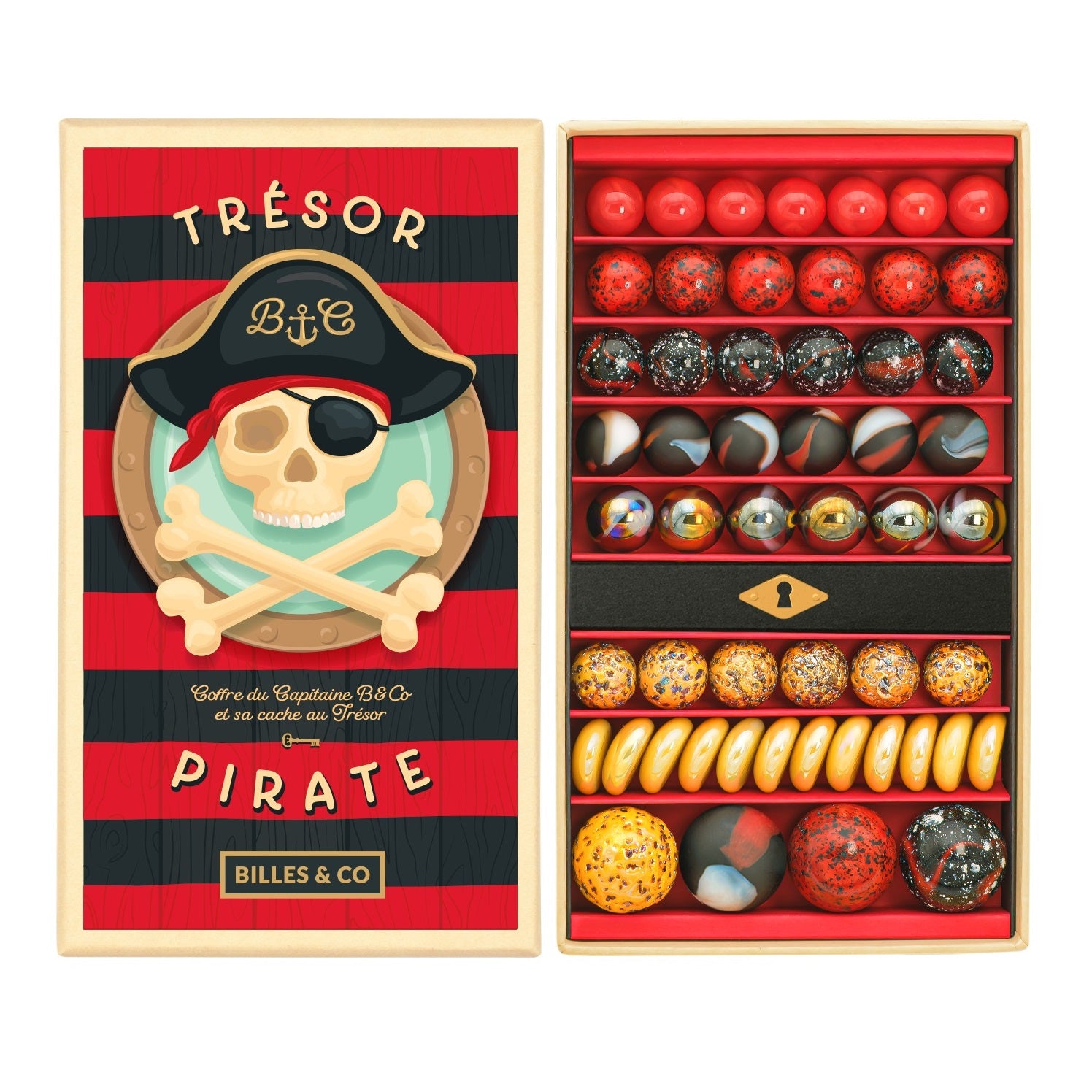 Billes&Co THE PIRATES' TREASURE ist ein Set aus 85 Glaskugeln und Kieselsteinen, die bunt in einer schön dekorierten Schachtel angeordnet sind. Die verschiedenen Farben, Texturen und Muster der Kugeln haben eine hypnotisierende Kraft, die Sie nicht vom Spiel ablenken wird. Die Kugeln sind thematisch angeordnet, so dass in kleinen Schachteln eine Art Universum entsteht.