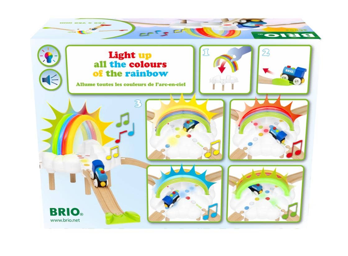 Folge den Lichtern und lass den Regenbogen in fröhlichen Farben erstrahlen! Dieses interaktive Set führt Kleinkinder auf unterhaltsame und fesselnde Weise in die Welt der BRIO-Holzspielzeuge ein. Das Ziel des Spiels ist einfach: Bringe den Regenbogen in all seinen schönen Farben zum Leuchten. Folge dazu mit einem kleinen Holzeisenbahnzug den blinkenden Lichtern auf den Schienen. Jedes Mal, wenn du den Lichtern durch die Wolke folgst und die Herausforderung meisterst, leuchtet der Regenbogen in einer von vier Farben auf und spielt eine bezaubernde Melodie. Bringe alle Farben zum Leuchten und du wirst mit einem lustigen Lied und einer Lichtshow belohnt. Dieses Set ist mit anderen Elementen von Brio World kompatibel.