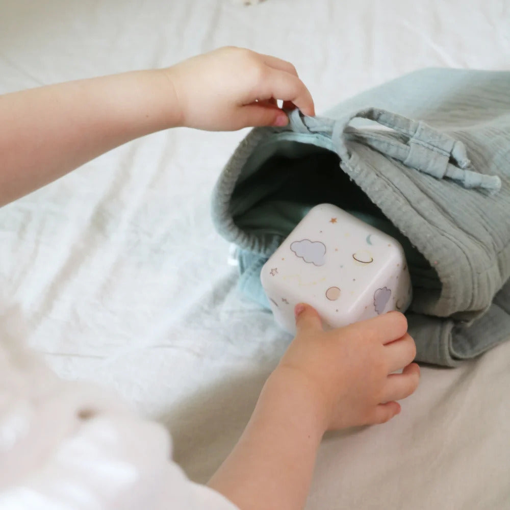 Cube B™ – eine innovative, tragbare Nachtlampe, die Ihr Kind mit warmem, beruhigendem Licht umhüllt und für einen ruhigen Schlaf zu Hause und auf Reisen sorgt.