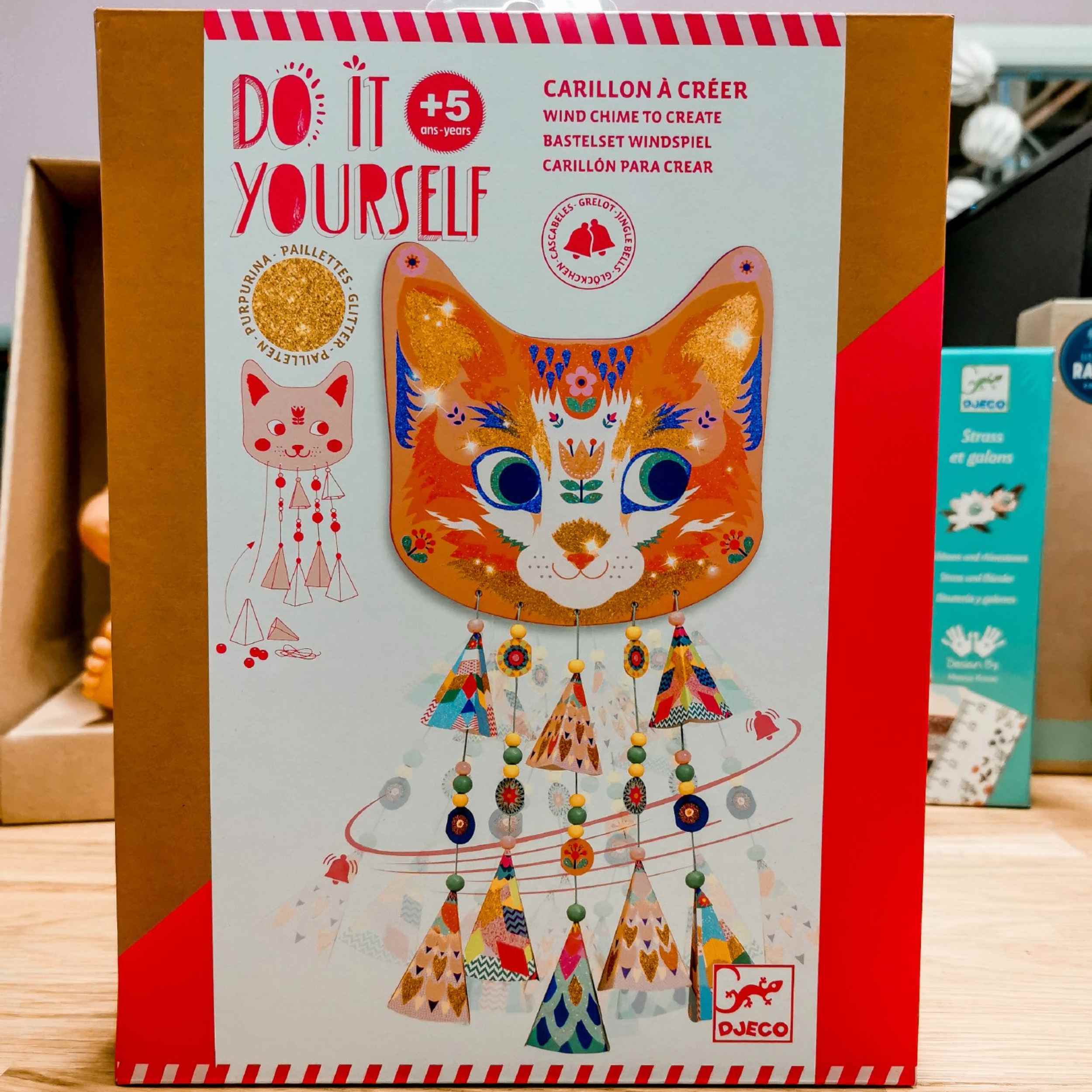Ein Set für Kinder zum Selbermachen eines Windspiels, das Ihr Zuhause wunderschön schmückt. Bei Luftbewegungen erzeugt es einen angenehmen Klang und die mit Glitzer verzierte Katze schimmert hübsch. Die Kartonelemente sind bereits ausgeschnitten, um die Aufgabe etwas zu erleichtern. Das Set fördert die manuellen Fähigkeiten des Kindes und trainiert die Konzentration.