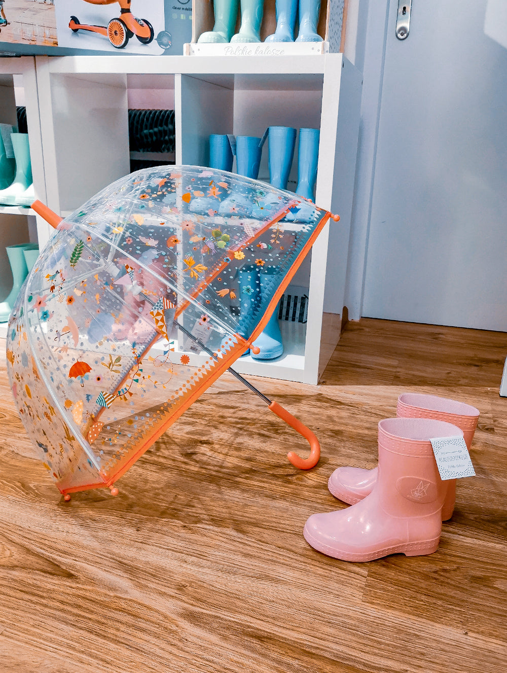 Ein schöner Regenschirm für Erwachsene aus Kunststoff, damit Sie genau sehen, wohin Sie gehen. Dieser Regenschirm schützt vor Regen und ist mit seinem schönen Design eine Augenweide. Sein Rahmen besteht aus Fiberglas, was ihn weich und langlebig macht. Die Kanten sind mit bunten Paspeln verziert. Die Stangen sind mit Kunststoffperlen versehen. Der Regenschirm verfügt über ein spezielles Öffnungssystem, das Ihre Hände vor Schnitten schützt. Der Djeco Kleine Blumen Regenschirm ist ein einzigartiger Begleiter für Spaziergänge im Regen.