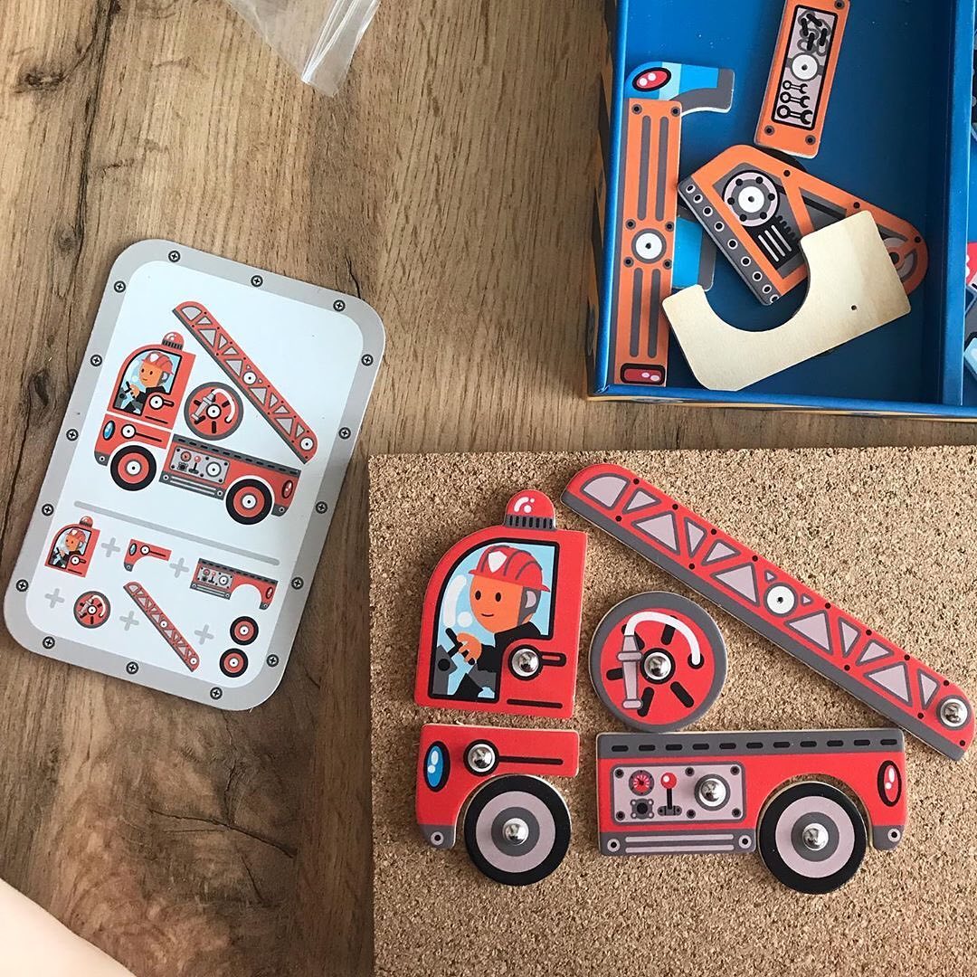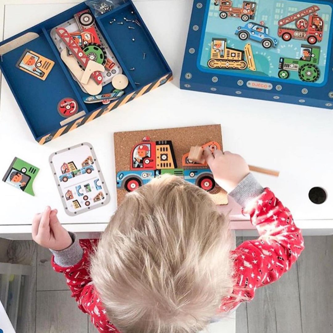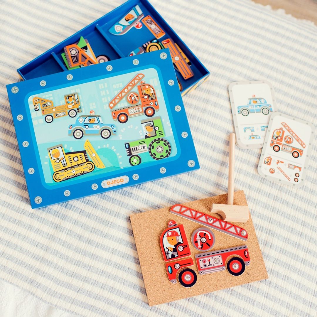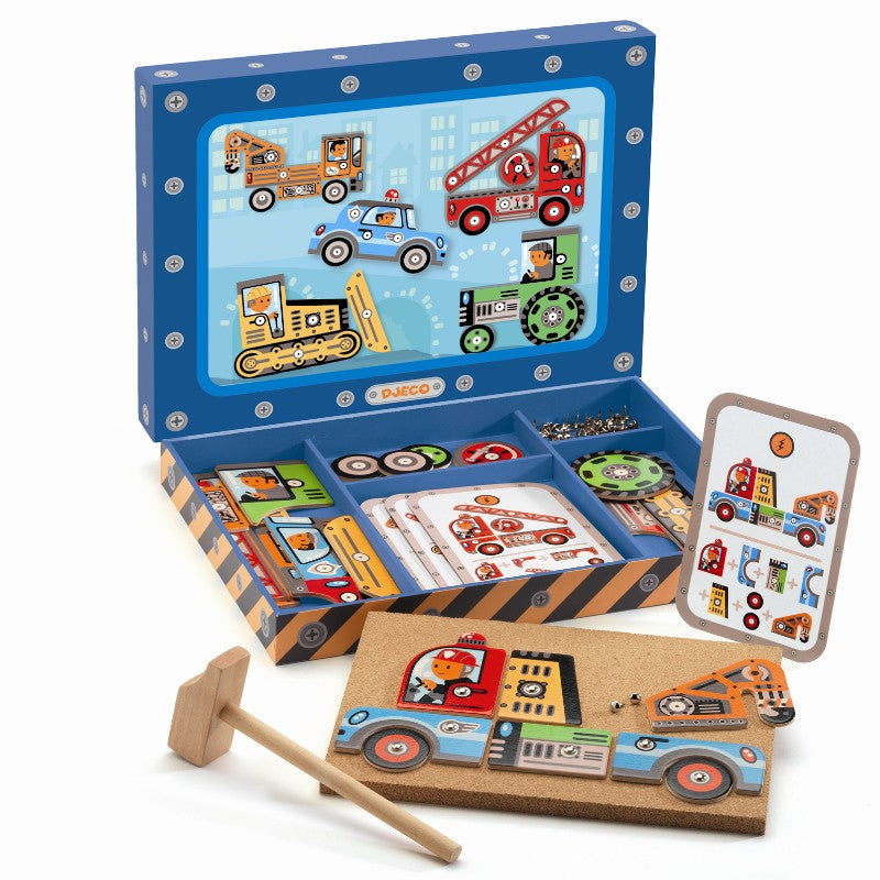 Ein Set für einen kleinen Konstrukteur, einen Heimwerker, der ein Fahrzeug nach seiner eigenen Idee oder der beiliegenden Anleitung bauen kann und es dann mit dem Holzhammer und den "Nägeln" an die im Set enthaltene Korkplatte nagelt. Das Set enthält: einen Holzhammer, eine Korkplatte, einen Satz Stecknadeln, einen Satz Karten mit Anleitungen zum Fahrzeugbau, Fahrzeugteile aus Holz, alles verpackt in einer schönen Pappschachtel.
