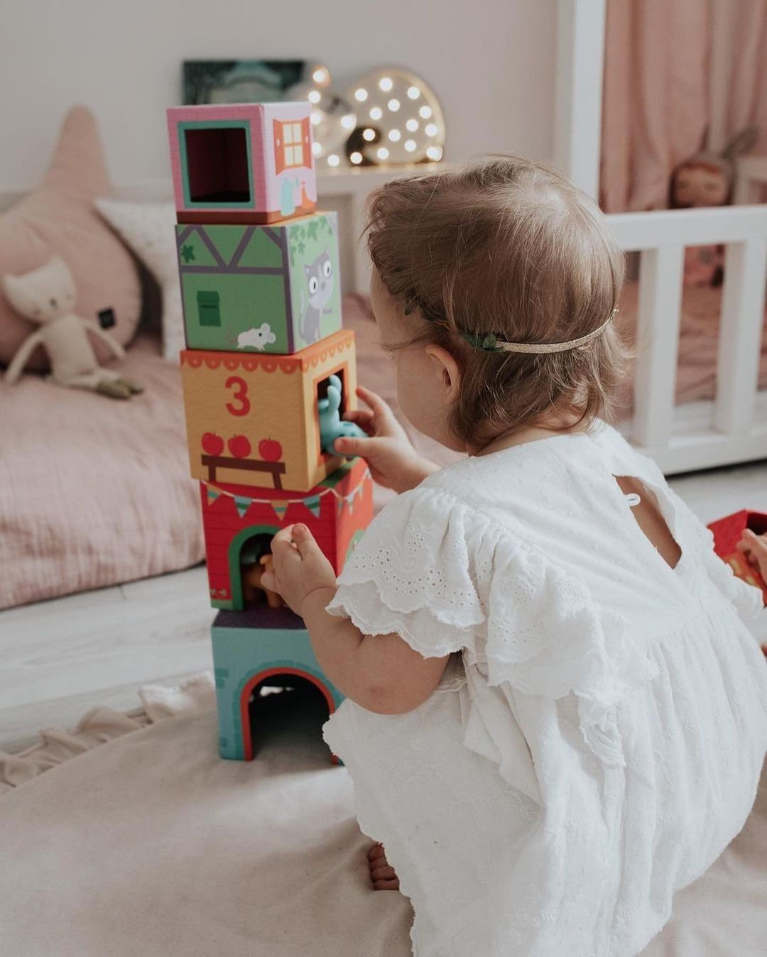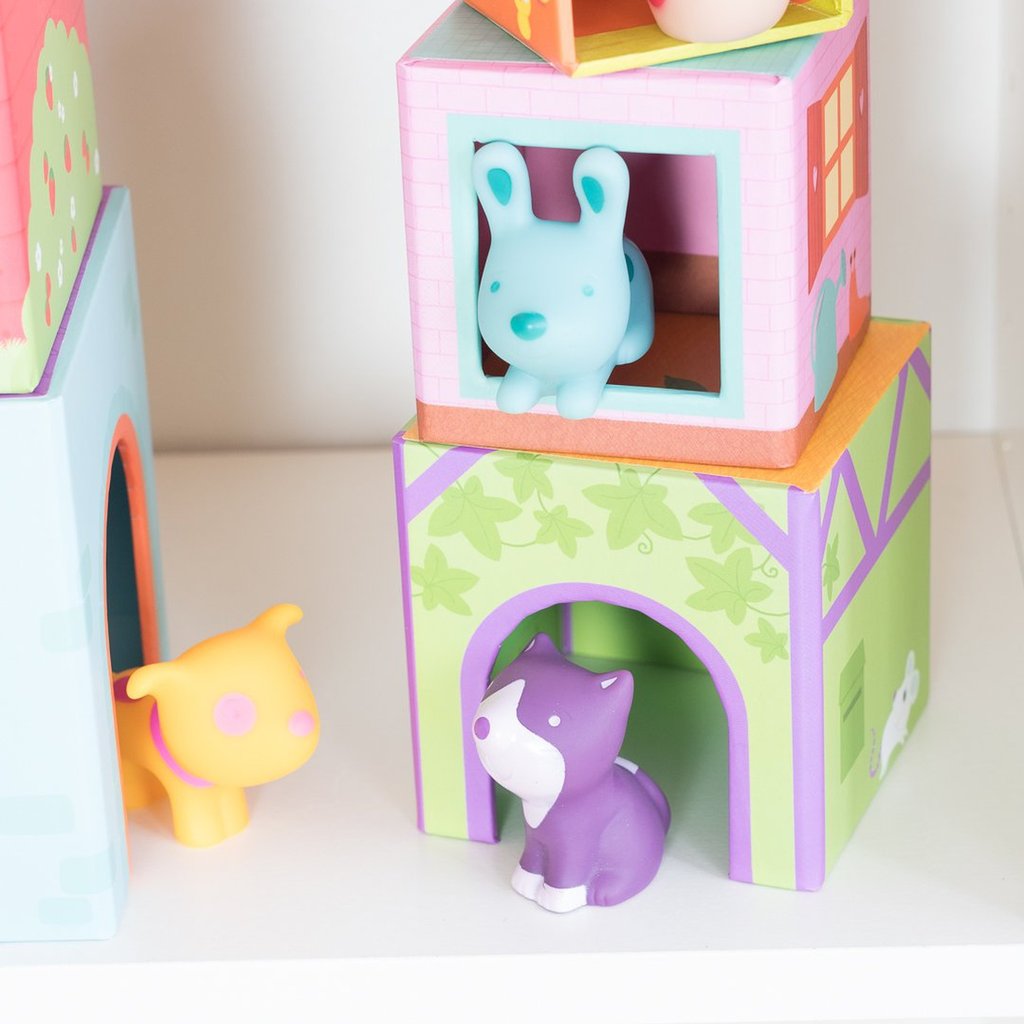 Ein Satz bunter Klötzchen-Boxen aus dickem lackiertem Karton. Jedes Stück ist mit Zahlen, Illustrationen mit Haus-, Garten- usw. Motiven bedruckt. In jeder Schachtel befindet sich ein Loch, in das ein Tier gesetzt werden kann. Das Kind kann die Blöcke nach seinen eigenen Vorstellungen anordnen und so Tierhäuser bauen. Die Blöcke sind in verschiedenen Größen erhältlich, so dass sie auch vertikal angeordnet werden können. Pädagogischer Wert: Entwicklung der motorischen Koordination, Präzision, Vorstellungskraft, Wahrnehmungsvermögen, Erlernen der Tiernamen, Grundlagen des Zählens.