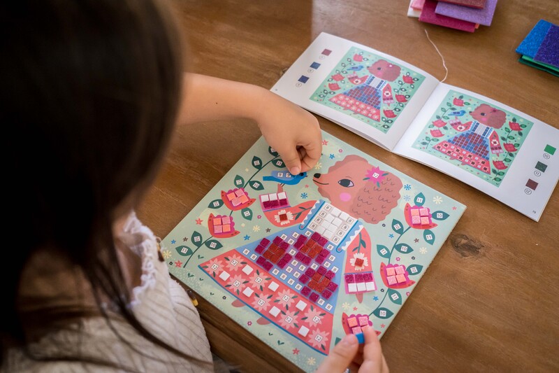 - Inhalt: 4 illustrierte Vorlagen, 12 Tafeln mit glänzenden Schaumstoff-Mosaiken, bebilderte Schritt-für-Schritt-Anleitung