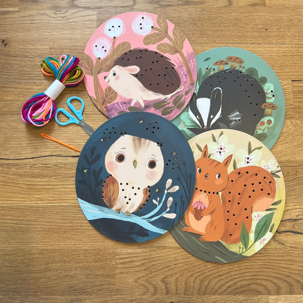 Ein wunderschön illustriertes Set zum Erlernen der Grundlagen des Stickens. Lernen Sie zwei verschiedene, aber sehr einfache Stiche. Die Bildkarten sind mit Waldtieren illustriert – Eichhörnchen, Eulen, Igeln und Dachsen.