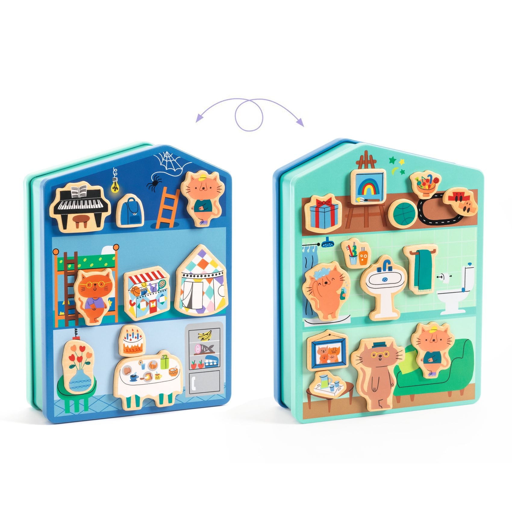 Das magnetische Puzzle in einer Metallbox garantiert endlosen Spielspaß. Bis zu 6 Räume des Katzenhauses können dekoriert werden. Das Set enthält 40 Teile mit verschiedenen Alltagsgegenständen und Figuren, die unter dieser Adresse wohnen. Der Spielspaß besteht darin, die magnetischen Puzzleteile an ausgewählten Stellen im Haus zu platzieren und so verschiedene Geschichten und Szenen zu gestalten.