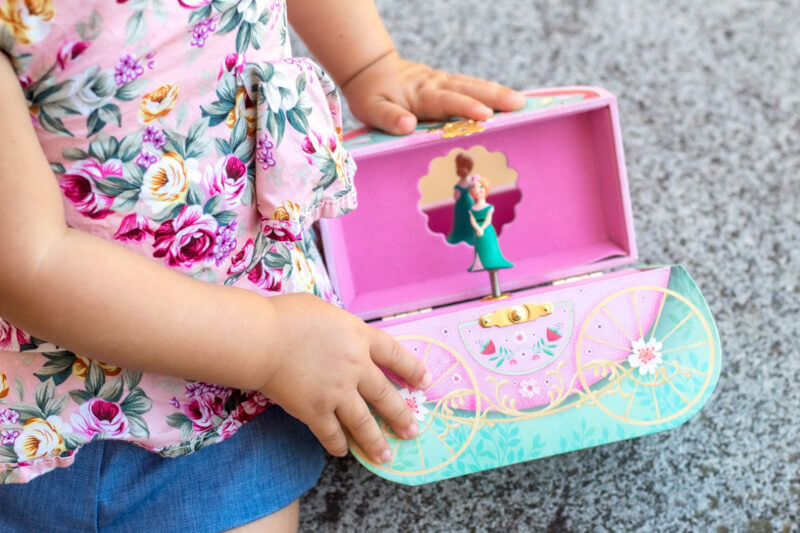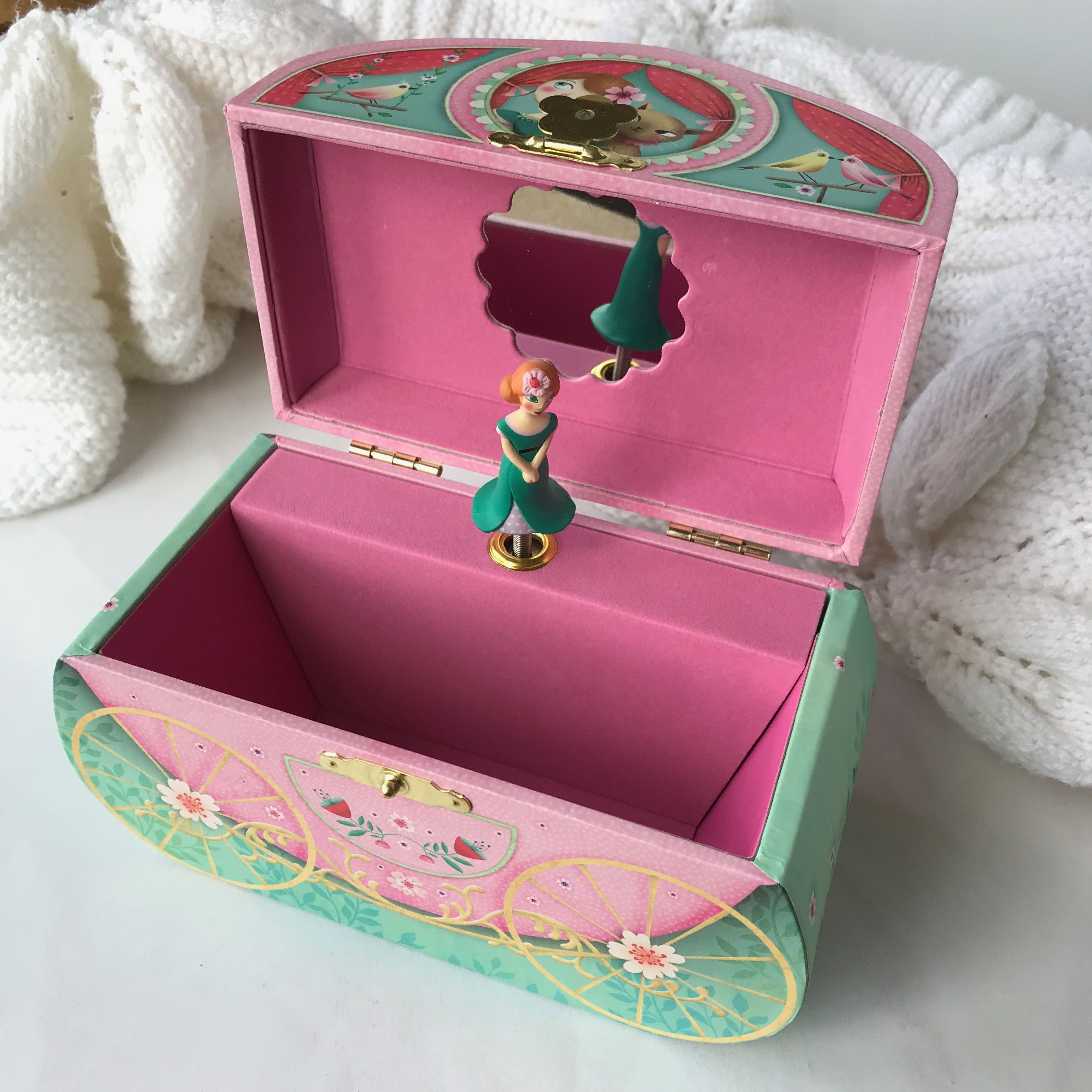 Eine schöne Schatulle mit Spieluhr von der französischen Marke Djeco. Ideal für die Aufbewahrung aller Arten von Kinderschätzen. Der traditionelle Aufziehmechanismus startet die Melodie von Leo Friedmans "Let Me Call You Sweetheart" und eine sich drehende Prinzessin. Die Schatulle wird eine wunderbare Dekoration für das Zimmer Ihrer Kleinen. Sie hat ein großes Fach für Schmuck und einen Spiegel.