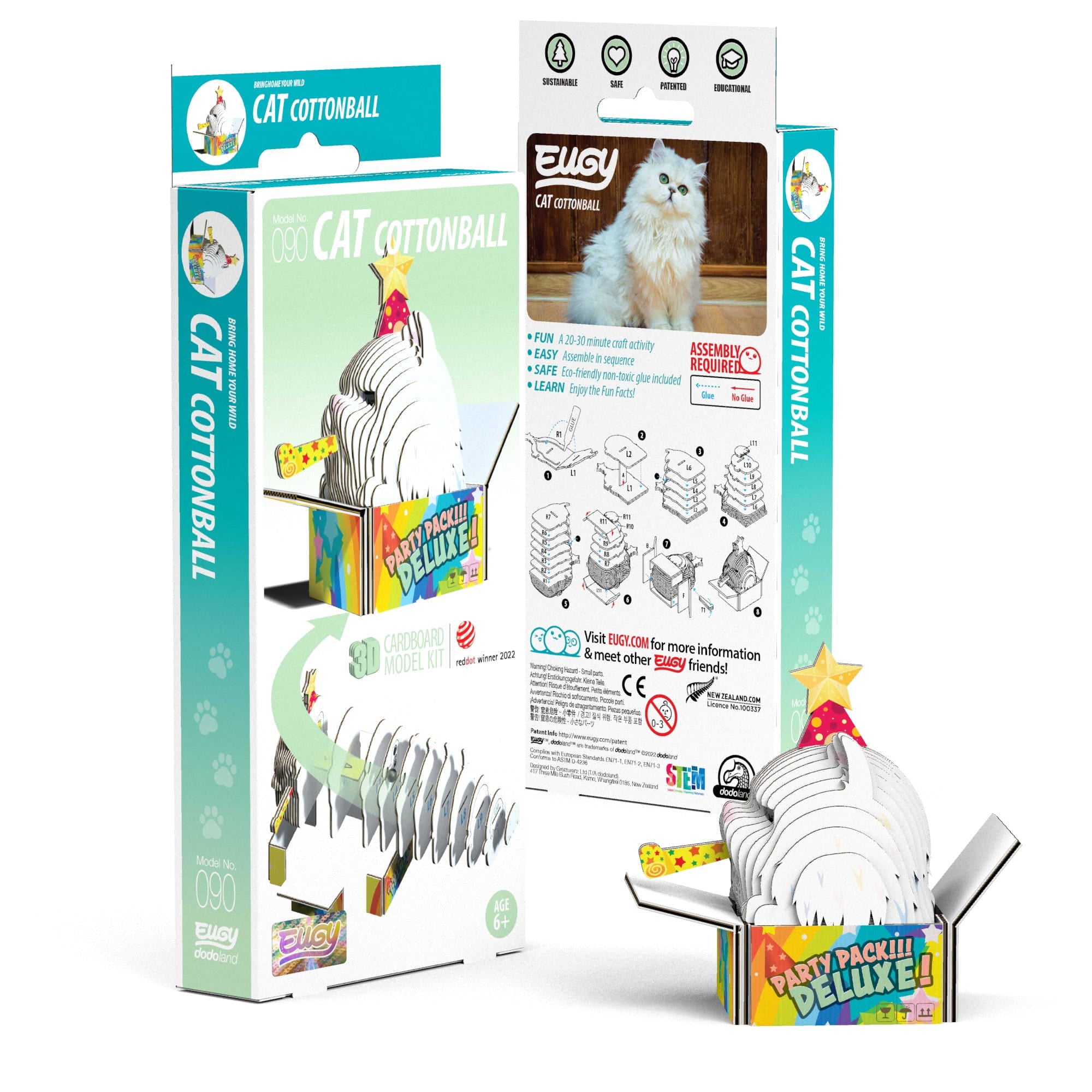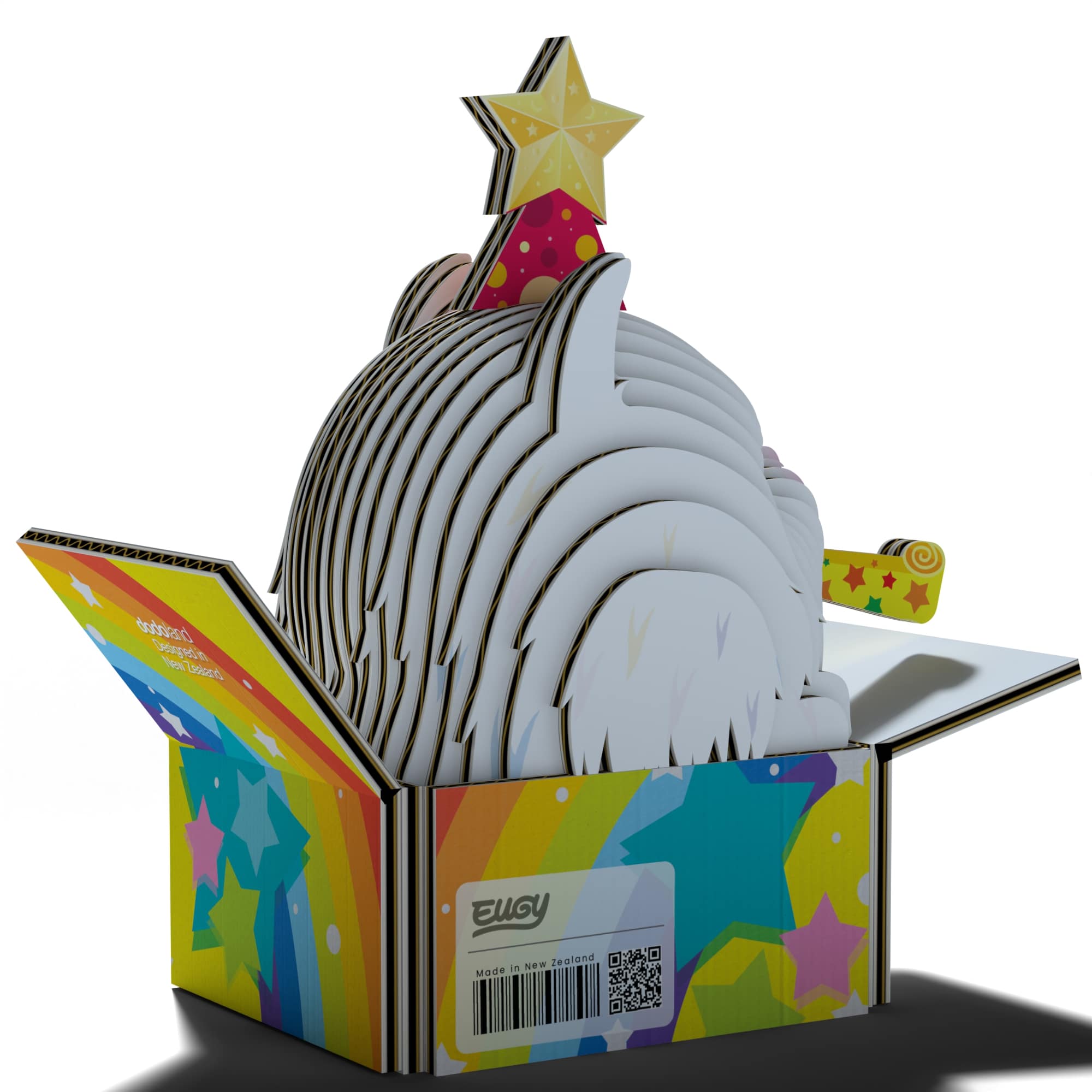 Eugy wurde in Neuseeland entworfen und aus umweltfreundlichem Recyclingkarton und Farbe auf Reisbasis hergestellt. Das Set enthält nummerierte Puzzleteile, ungiftigen Klebstoff und eine Bauanleitung für das Tier. Sammeln Sie eine ganze Reihe von Tieren, Vögeln, Dinosauriern und mehr. Für Kinder ab 6 Jahren.