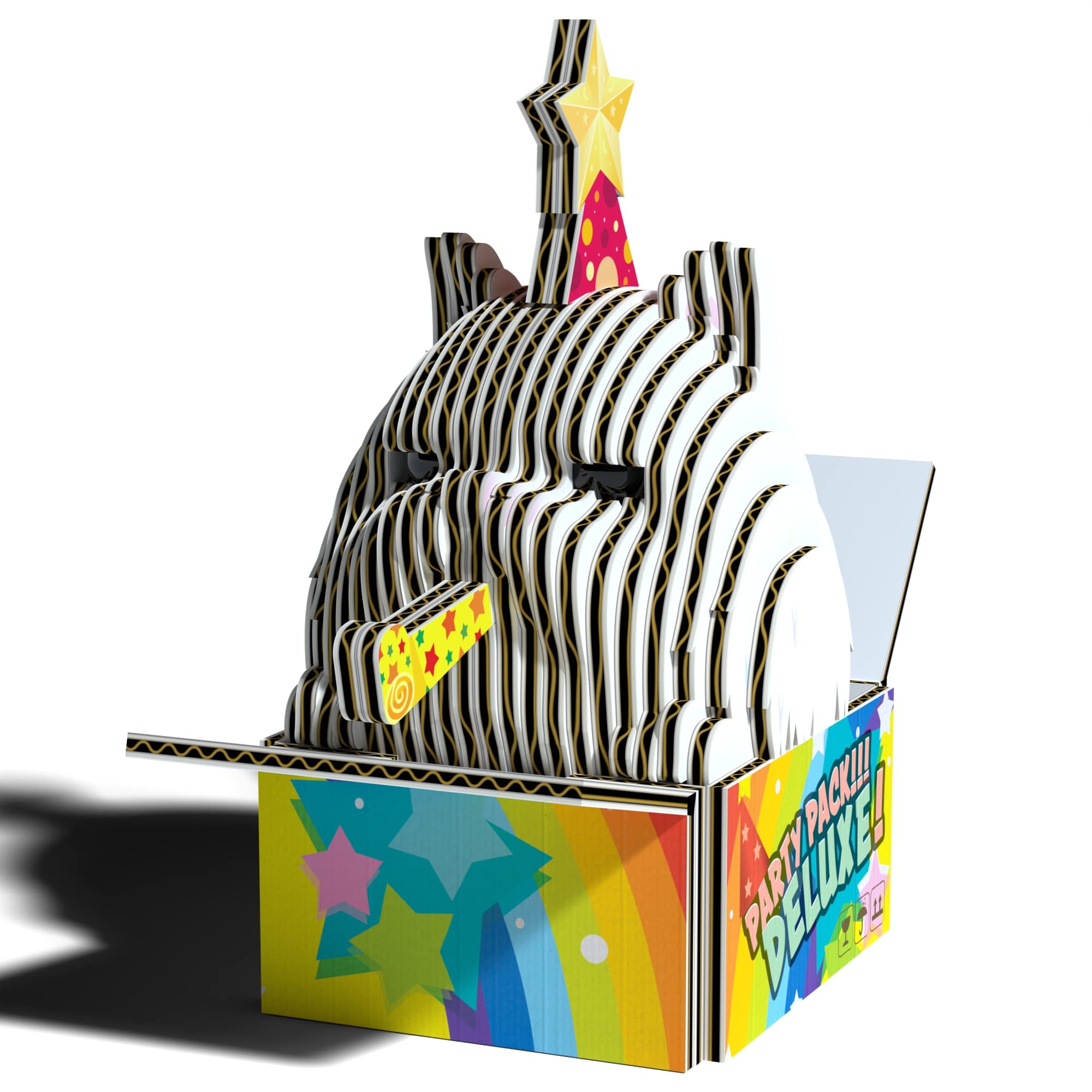 Eugy , die Katze, hat eine Geburtstagskappe und eine Trompete in der Schnauze, denn sie ist ein richtiges Partytier. Das Kätzchen sitzt in einer farbenfrohen Schachtel mit Partydekoration, vielleicht hat es aus dieser Schachtel den Umhang und die Trompete gewonnen.