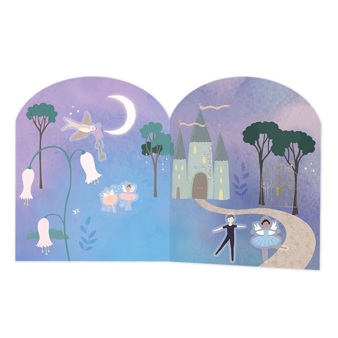 Das Set wiederverwendbarer Aufkleber mit Balletttänzerinnen-Tafeln macht Spaß und ist gleichzeitig lehrreich. Das Set enthält über 50 lustige, bunte Aufkleber, darunter Balletttänzerinnen, einen lächelnden Mond, bunte Vögel, Kaninchen, Insekten, magische Gegenstände und vieles mehr sowie 2 ausklappbare Spieltafeln, die ein Schloss auf einem Hügel und eine Szene in einem Zauberwald zeigen, um mit Hilfe der Aufkleber Geschichten zu erfinden und zu erzählen. Die Aufkleber lassen sich leicht anbringen, übereinanderlegen und verschieben. Ein zusätzlicher Spaß ist es, die Aufkleber ihren Formen auf den Aufbewahrungskarten zuzuordnen. Das sorgt für stundenlangen Spielspaß für die Kleinen! Das Set bietet Kindern unbegrenzte Möglichkeiten, ihre Kreativität auszuleben, trainiert außerdem ihre Konzentration und Fantasie und fördert die Feinmotorik. Das Set ist in einem Hartcover verpackt, lässt sich vollständig flach zusammenlegen und eignet sich daher ideal für unterwegs.