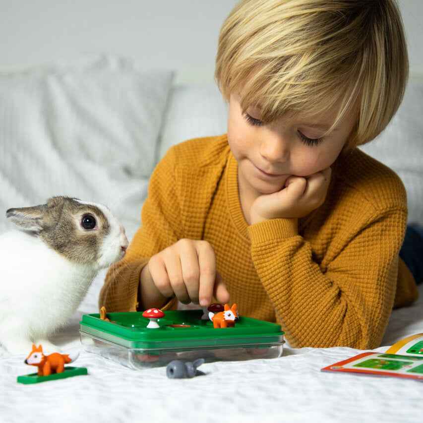 - Im Set enthalten: tragbare Spieltafel mit Abdeckung, 3 Kaninchen, 3 Pilze, 2 Füchse, Heft mit 60 Aufgaben und Lösungen