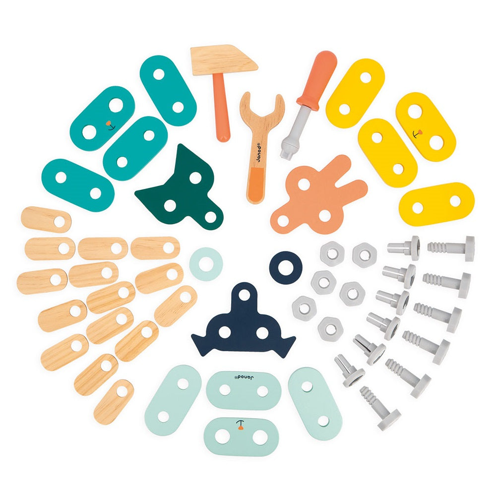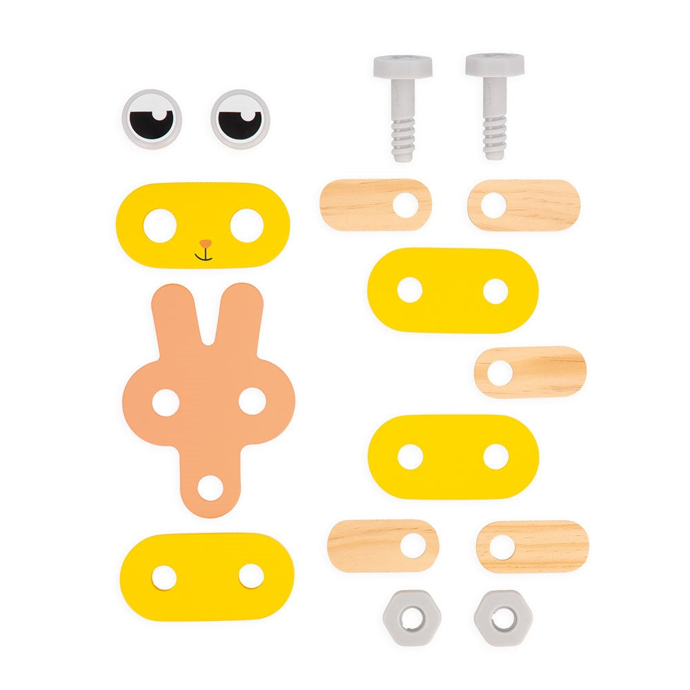 Die hölzernen Selbstbau-Tiere mit Werkzeug aus der Brico'kids-Serie der französischen Marke JANOD sind das perfekte Geschenk für kleine Heimwerker. Das Set besteht aus 53 Elementen - Teile zum Bau von drei niedlichen Tieren (eine Katze, ein Hund und ein Hase), Schrauben, Muttern, Kappen und notwendige Werkzeuge - ein Schraubendreher, ein Schraubenschlüssel und ein Hammer. Das Spielzeug unterstützt die Entwicklung des Kindes auf vielen Ebenen: Es fördert die handwerklichen Fähigkeiten, die Bewegungspräzision, die Geduld und die Konzentration, regt die Fantasie an und regt zum Erfinden von Geschichten und Rollenspielen an, die man vom Beobachten der Erwachsenen kennt. Die fertigen Tiere können eine schöne Dekoration für das Kinderzimmer werden.