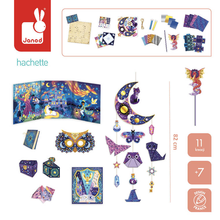 Im Set enthalten sind ein Traumfänger mit Mond und Origami-Figuren, ein Zauberstab , ein Zauberbuch, eine fantastische Eulenmaske, 3 Wahrsager aus Papier , ein 3-teiliges Sandbild, 2 Schatzkisten und ein Zaubererwappen mit Mosaik.