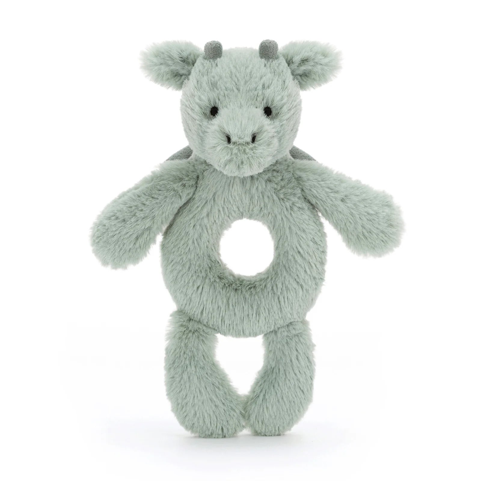 Ein sehr schöner und fühlbarer Drache von Jellycat mit einer Rassel, die man knuddeln und drücken kann. Er hat entzückende Ohren und einen donutförmigen Bauch mit einem Loch. Sofort bereit für ein bisschen Spielspaß! Der Drache wurde aus recycelten Fasern genäht. Eine tolle Geschenkidee für eine Babyshower.