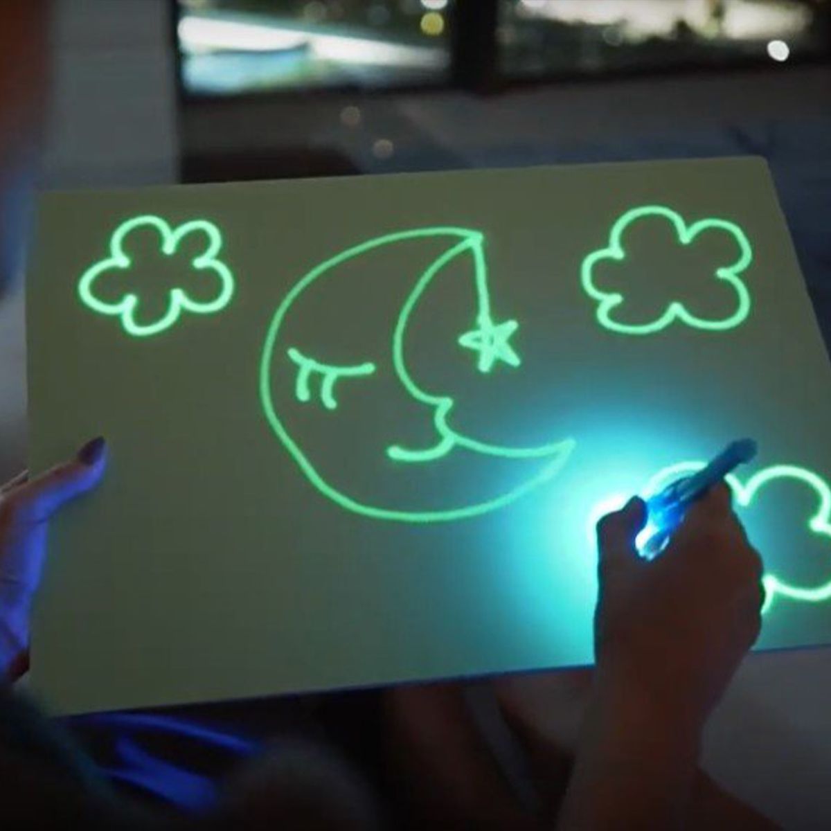 Pintafluo ist ein doppelseitiges, lichtempfindliches Whiteboard, auf dem man mit speziellen Leuchtstiften erstaunliche, leuchtende Zeichnungen erstellen kann. Es funktioniert nach dem Prinzip der Photolumineszenz - je dunkler der Raum, desto heller und länger leuchten Ihre Kreationen! Der Effekt ist wirklich magisch und Zeichnungen können bis zu 20 Minuten lang in völliger Dunkelheit sichtbar sein!