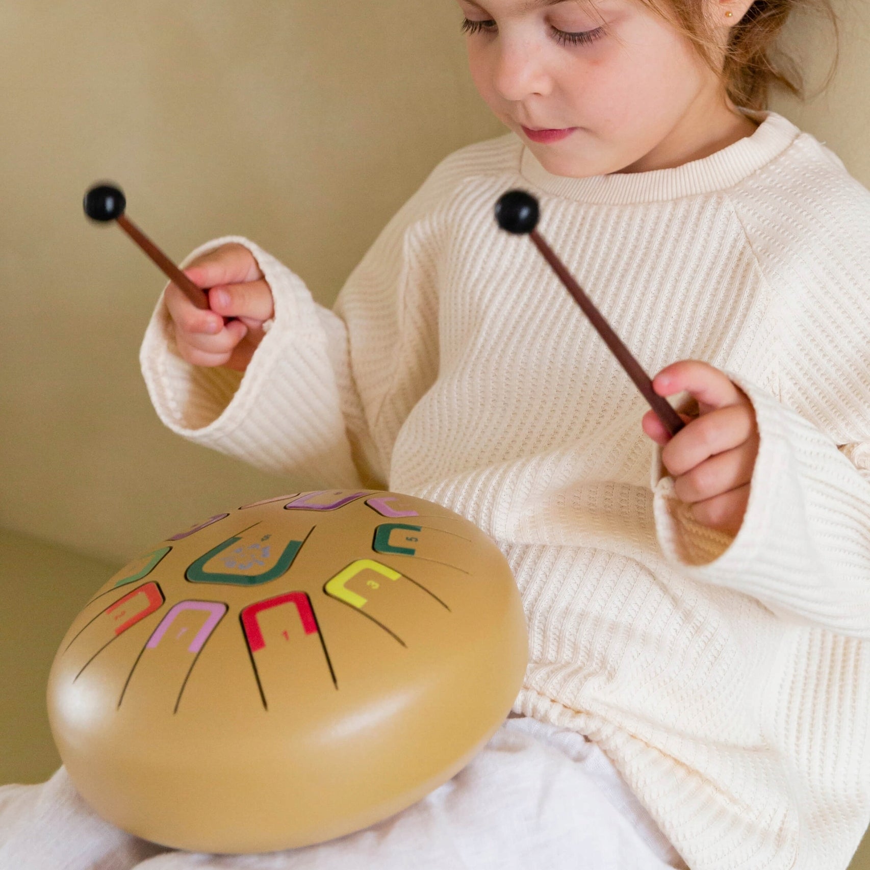 Die Tambu ist eine Art melodische Zungentrommel, die Sie in die aufregende Welt des Spielens mit Tönen einführen wird. Die Tambu ist eine kompakte, runde, 8 Zoll (20 cm) große Stahltrommel, die bis zu 11 Töne verbirgt. Ein ganzes Universum von Melodien steht Ihnen zur Verfügung. Lassen Sie sich von ihrem samtenen und entspannenden Klang überraschen und entfesseln Sie das künstlerische Talent Ihres Kindes oder Ihres eigenen!