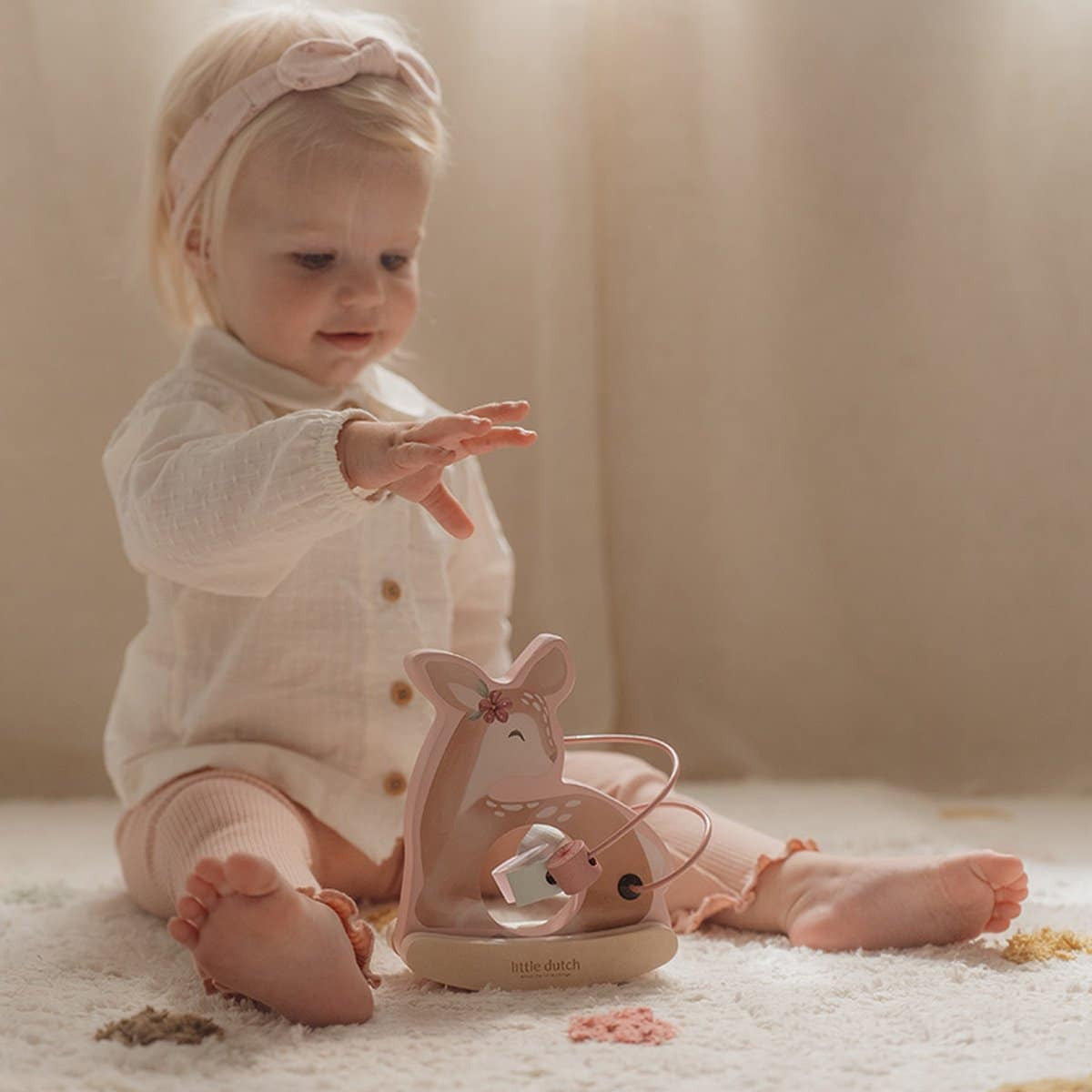 Fairy Garden Activating Spiral Sarena FSC von Little Dutch, dieses bezaubernde Spielzeug fördert die motorischen Fähigkeiten kleiner Hände und bringt einen Hauch von Magie in jede Spielzeit. Setzen Sie den Hirsch in eine sanfte tanzende Bewegung um den Feengarten. Die Perlen mit den Abbildungen einer Biene, eines Schmetterlings, eines Blattes und einer Blume können entlang der Spirale des Hirsches bewegt werden. Dieses Spielzeug ist eine tolle Geschenkidee für Kleinkinder und die perfekte Ergänzung zu den anderen Spielzeugen aus der Fairy Garden Kollektion von Little Dutch.