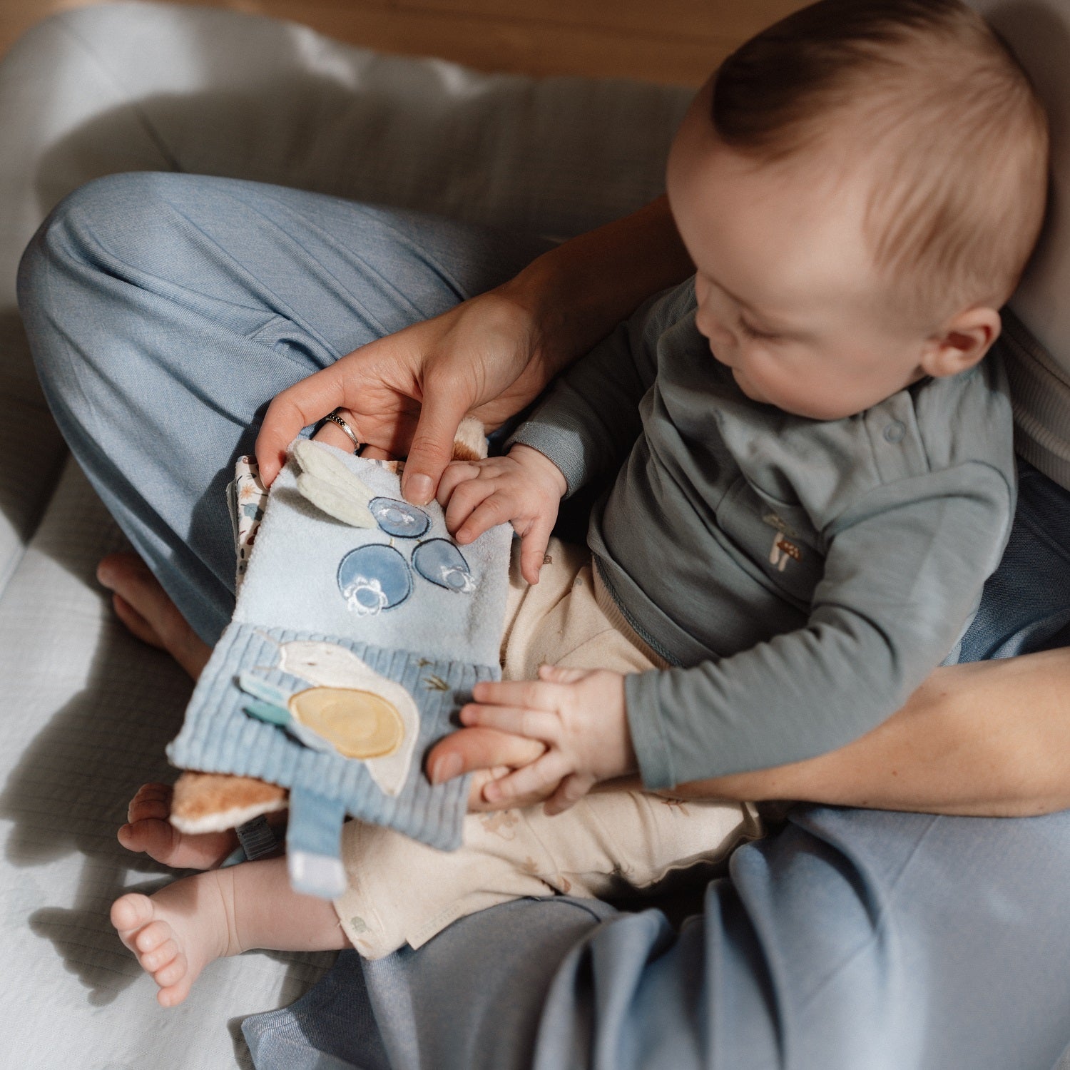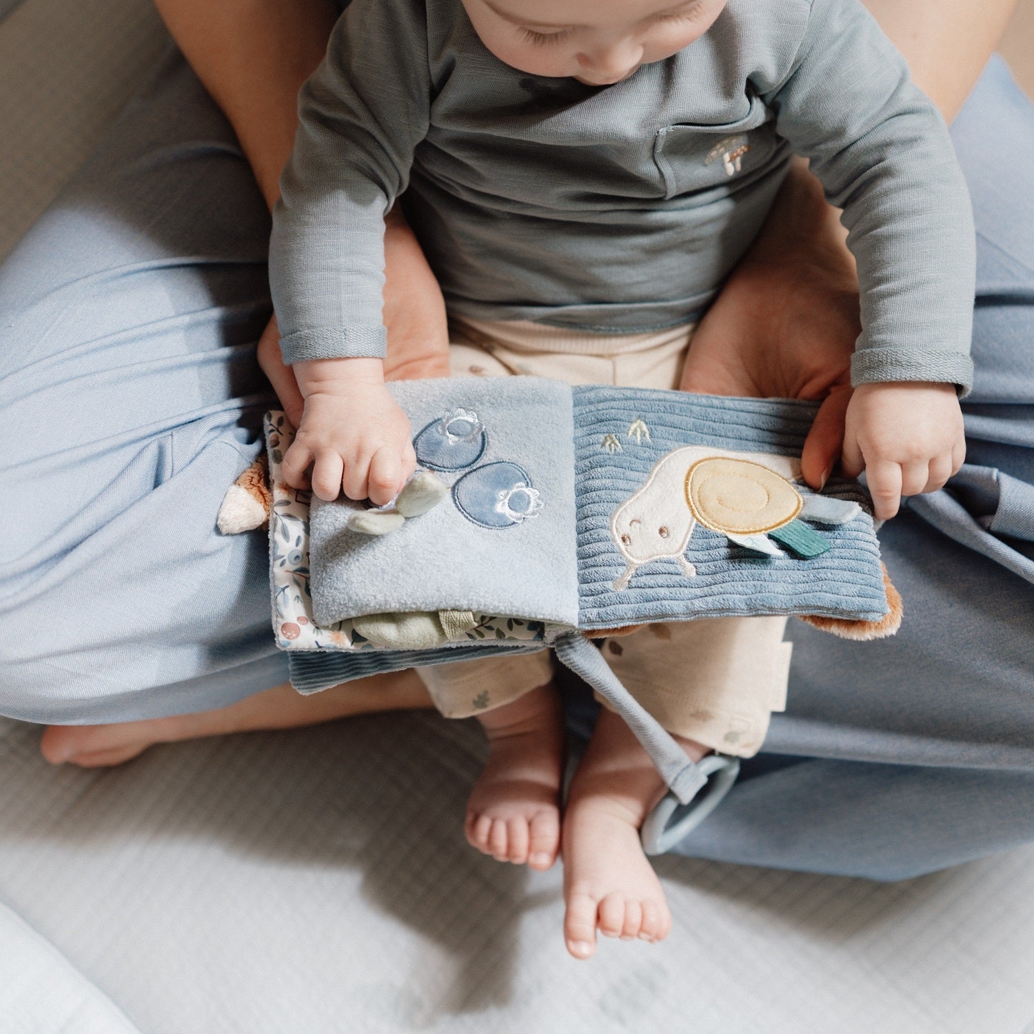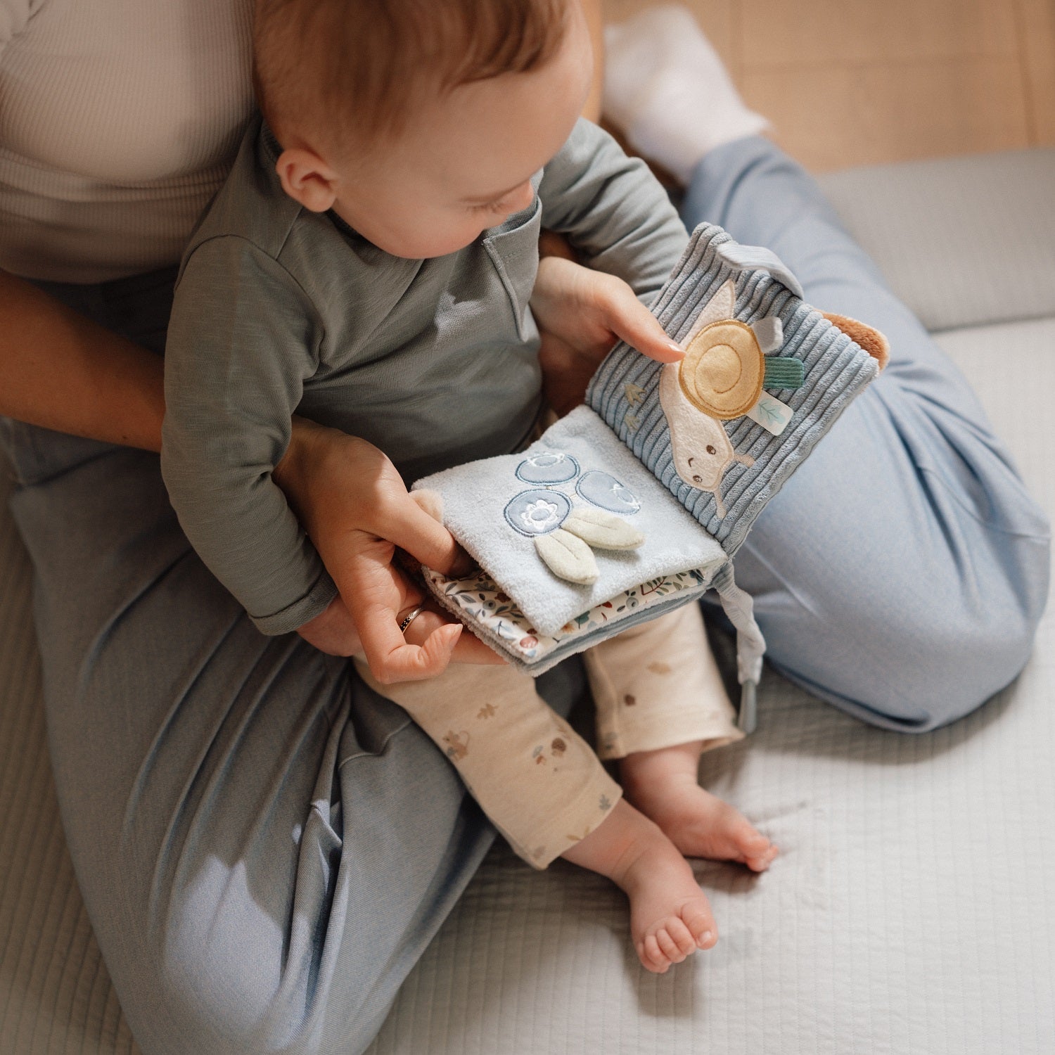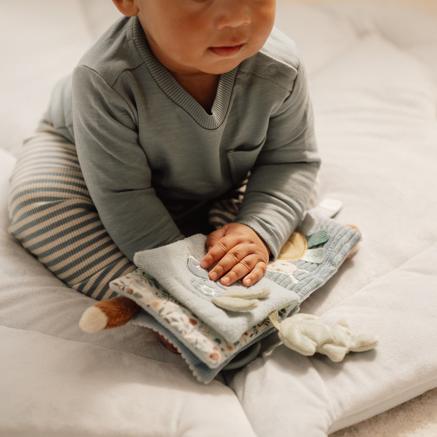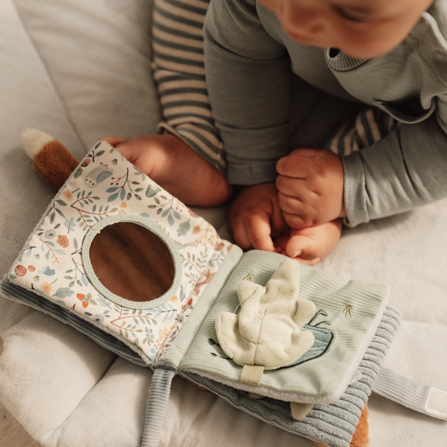 Das Forest Friends Aktivitätsbuch von Little Dutch. Es enthält eine Vielzahl von Materialtexturen, die die Sinne Ihres Kindes fördern. Das Buch hat einen Spiegel, Anhänger, Rascheln und eine Rassel, sehr beliebt bei Kleinkindern. Es ist ideal für die Entwicklung der Hand-Augen-Koordination. Er kann mit einem Ring an einem Kinderwagen, einer Babytragetasche oder einem Autositz befestigt werden.