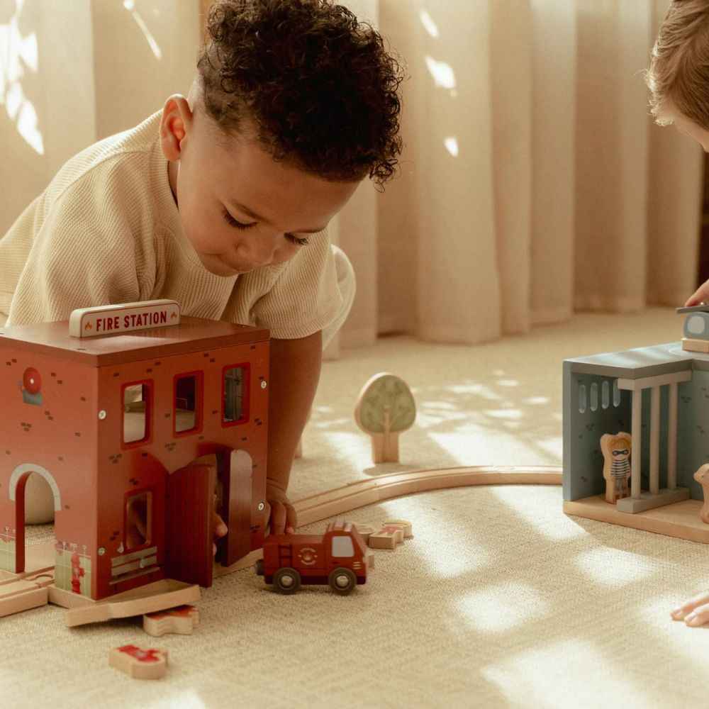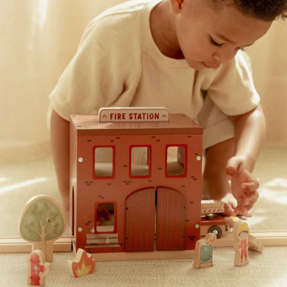 Die hölzerne Feuerwache von Little Dutch ist das perfekte Spielzeug für jeden kleinen Helden, der davon träumt, Feuerwehrmann zu werden. Mit diesem Set kann das Kind spannende Szenarien nachspielen – vom Löschen eines Brandes über die Rettung von Tieren bis hin zum Alltag in der Feuerwache. Das Set fördert die Kreativität, die motorischen Fähigkeiten und lehrt Zusammenarbeit und Hilfsbereitschaft. Es ist aus hochwertigem FSC-zertifiziertem Holz gefertigt, mit unbedenklichen Farben auf Wasserbasis bemalt und somit nicht nur schön, sondern auch sicher für die Kleinsten.