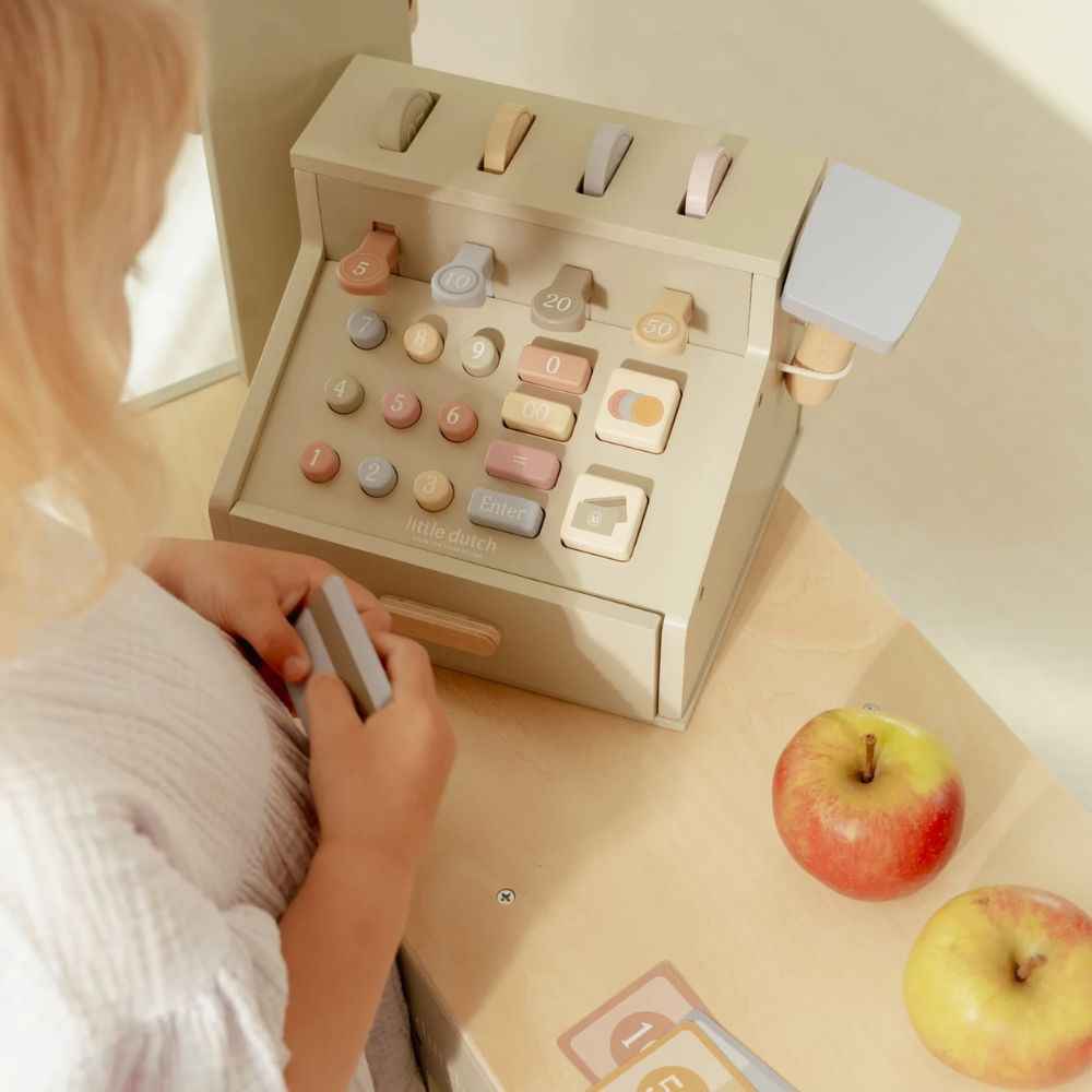 Die Holzkasse ist eine Neuauflage des Bestsellers, der seit Jahren sowohl bei Kindern als auch bei Eltern beliebt ist. Es ist ein ideales Spielzeugkassette für den Spielzeugladen – ausgestattet mit einem Terminal, Münzen und Banknoten, die in der Kassenschublade aufbewahrt werden können. Damit kann sich Ihr Kind wie ein echter Verkäufer fühlen und beim Spielen mit Eltern, Freunden oder seiner Lieblingspuppe in die Rolle eines Kassierers schlüpfen.