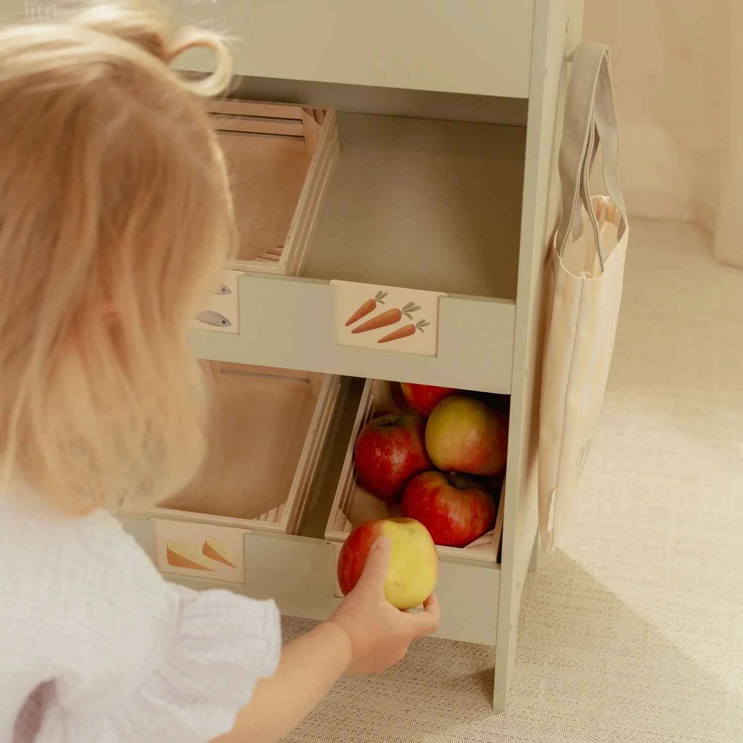- Im Set enthalten: 4 Holzkisten, Stoffdach, 8 bunte Einlagen mit Zeichnungen von Obst und Gemüse sowie ein Baumwollnetz zum Einkaufen