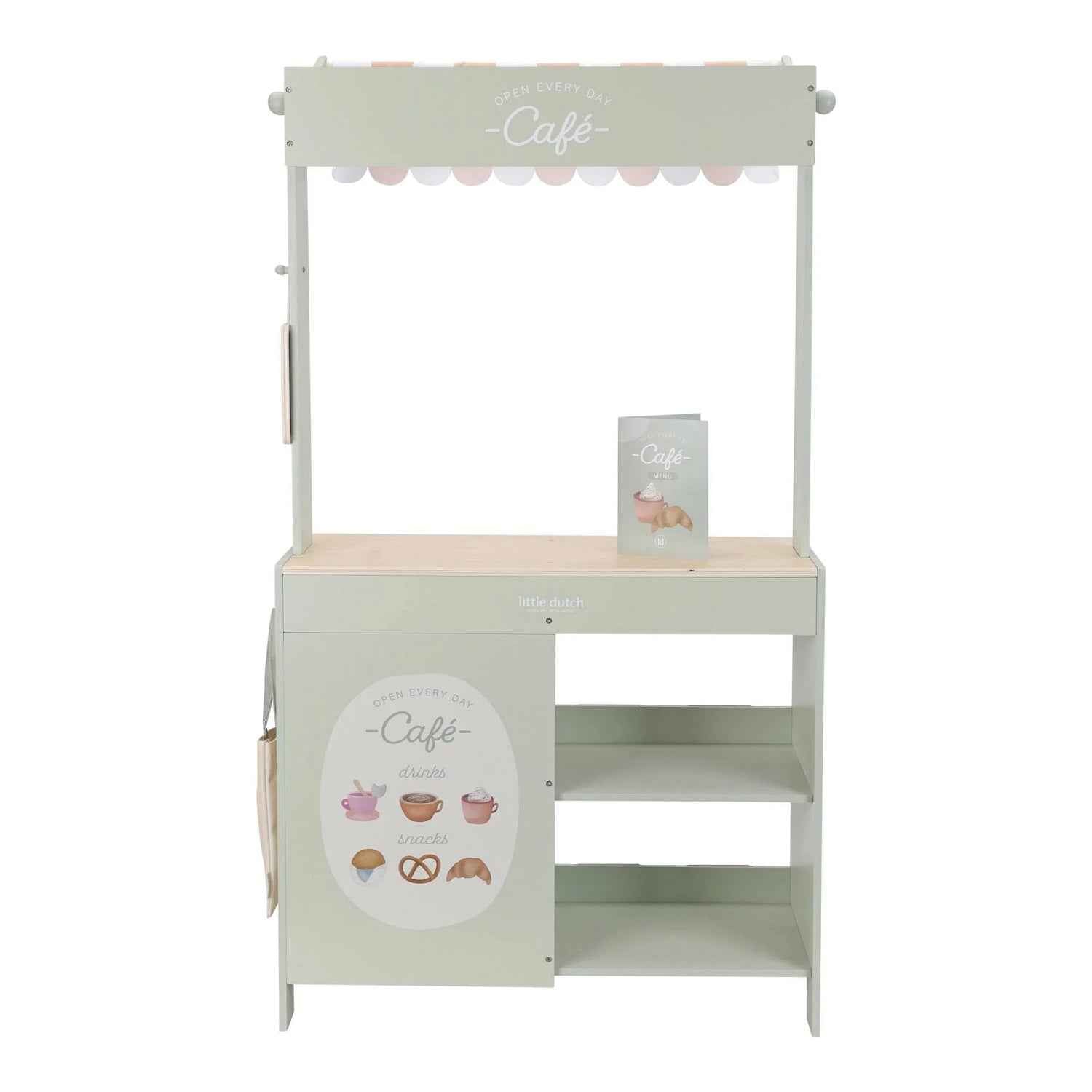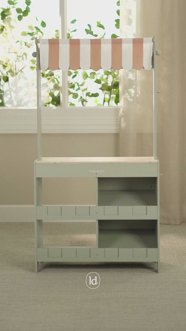 Der Holzverkaufsstand von Little Dutch ist ein großartiges Angebot für kleine Liebhaber des Spiels „Laden“. Ausgestattet mit 4 Holzkisten, ideal zum Sortieren und Ausstellen von Obst und Gemüse, sowie einem Stoffdach, das Charme verleiht und eine authentische Marktatmosphäre schafft. Dank der beiliegenden Tafel und den illustrierten Karten können Kinder ihre Produkte ganz einfach präsentieren. Das Set enthält außerdem 8 bunte Einlagen mit Zeichnungen von Obst und Gemüse sowie eine Baumwoll-Einkaufstasche. Und das ist noch nicht alles! Wenn man den Marktstand umdreht, verwandelt er sich in ein niedliches Café mit Speisekarte und lustigen Illustrationen. Kombinieren Sie ihn mit einer Waage, einer Kasse oder einer Kuchenplatte, um ein noch realistischeres und entwicklungsförderndes Spiel zu schaffen.