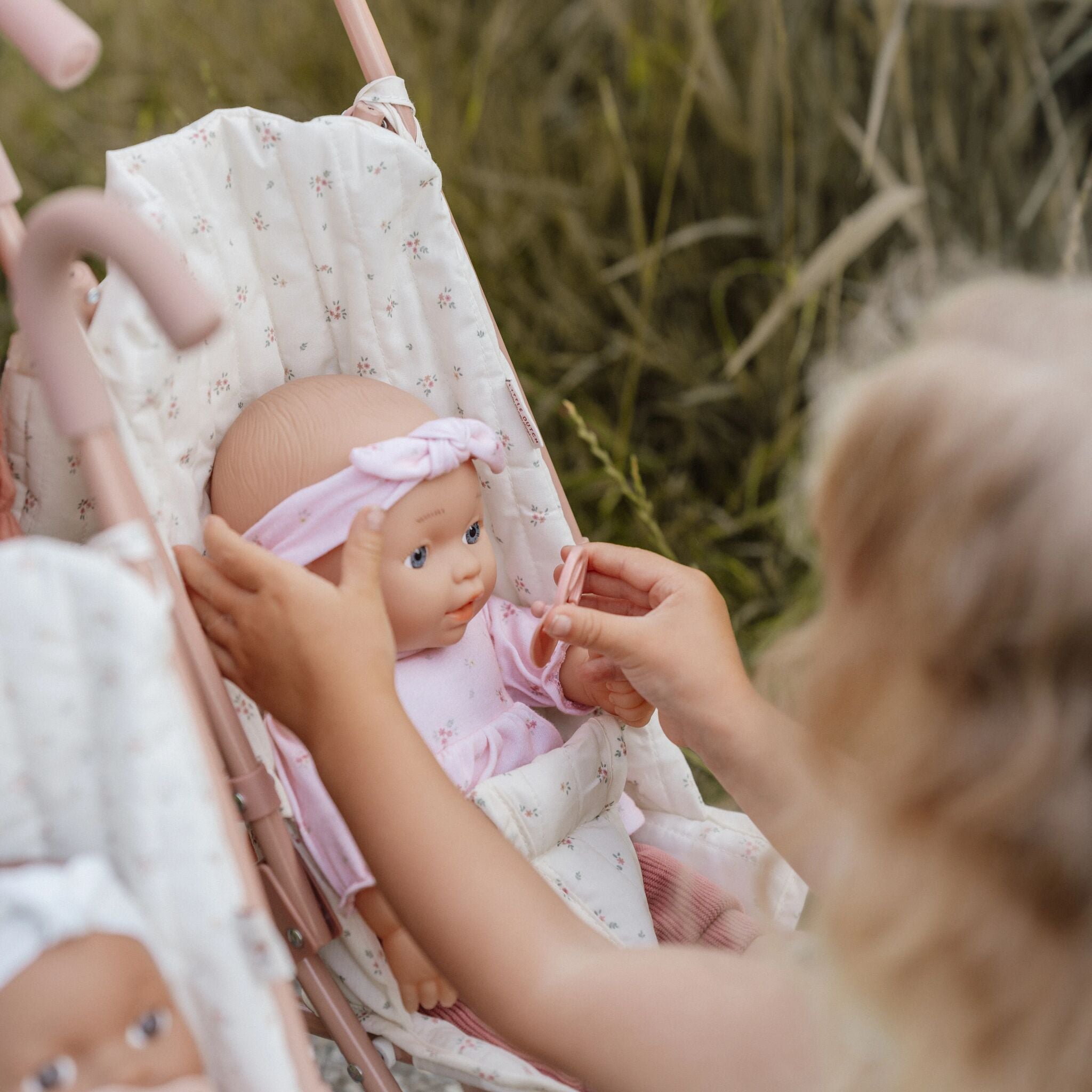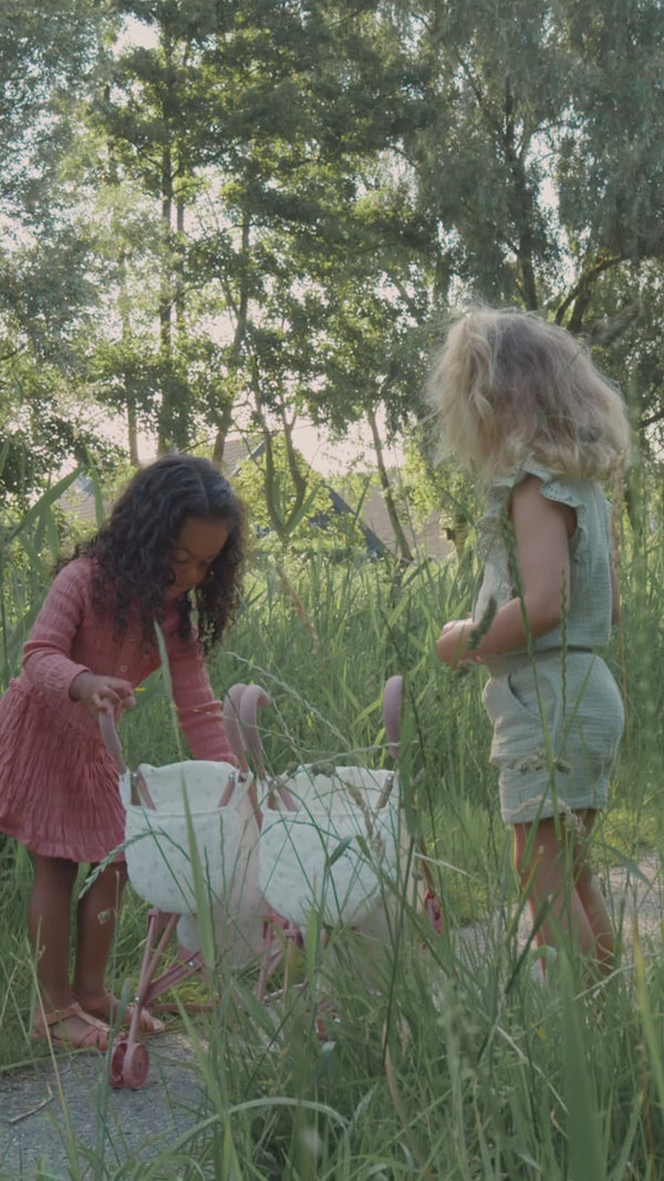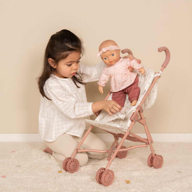 Zusammenklappbarer Puppenwagen von Little Dutch - wohin wird dich deine Fantasie heute führen? Setzen Sie Ihre Lieblingspuppe oder Ihr Kuscheltier hinein und lassen Sie sich vom Kinderwagen in ein neues Abenteuer führen. Der Kinderwagen ist mit einem Stoff mit White Meadows-Muster gepolstert und die passende Tragetasche bietet Platz für Puppenzubehör und Kinderwagenutensilien. Der Gurt sorgt dafür, dass die Puppe während des Spaziergangs nicht herausfällt.