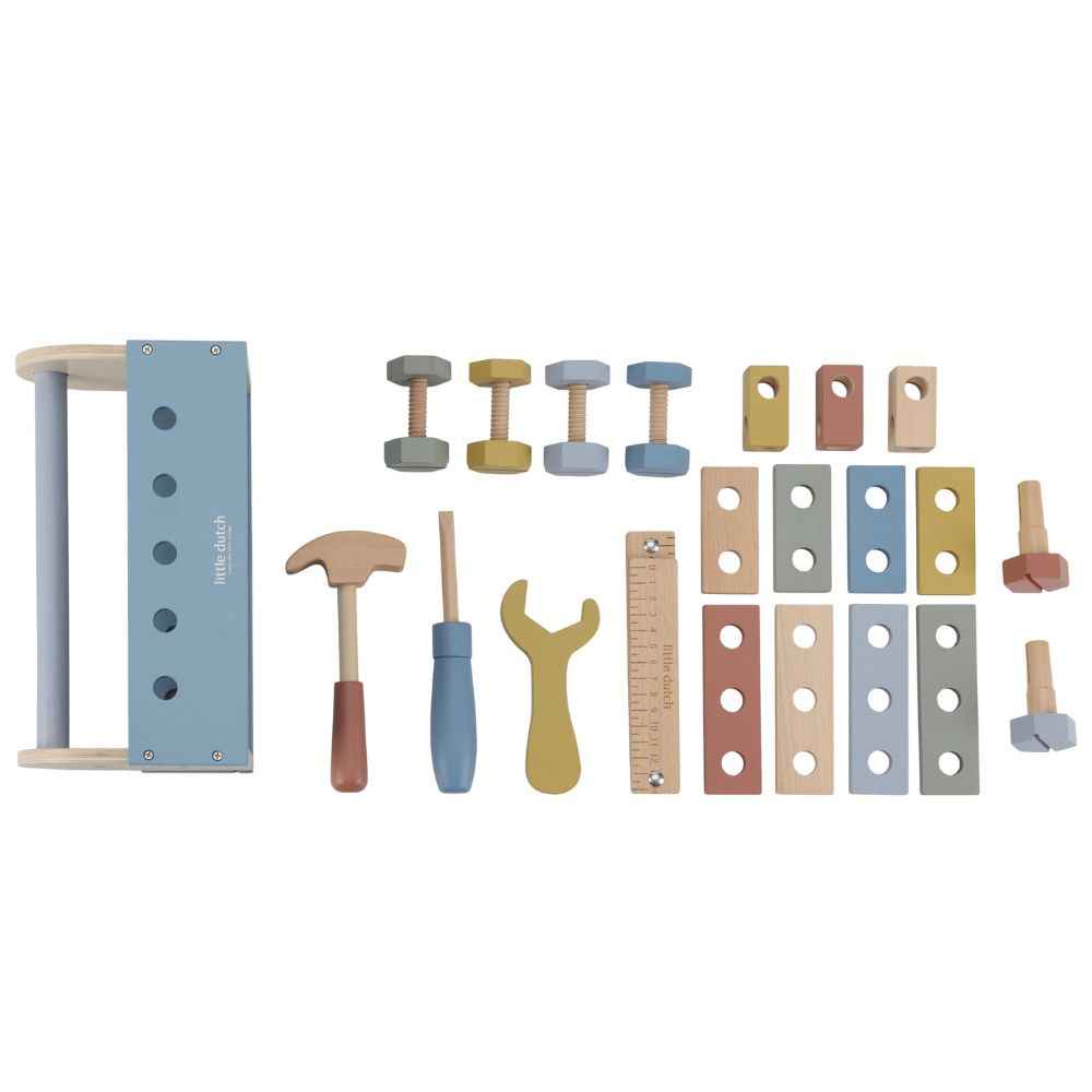 - Inhalt des Sets: Werkzeugkasten, Werkzeuge (Hammer, Schraubendreher, Schraubenschlüssel), Schrauben, Unterlegscheiben und Verbindungselemente – insgesamt 20 Teile
