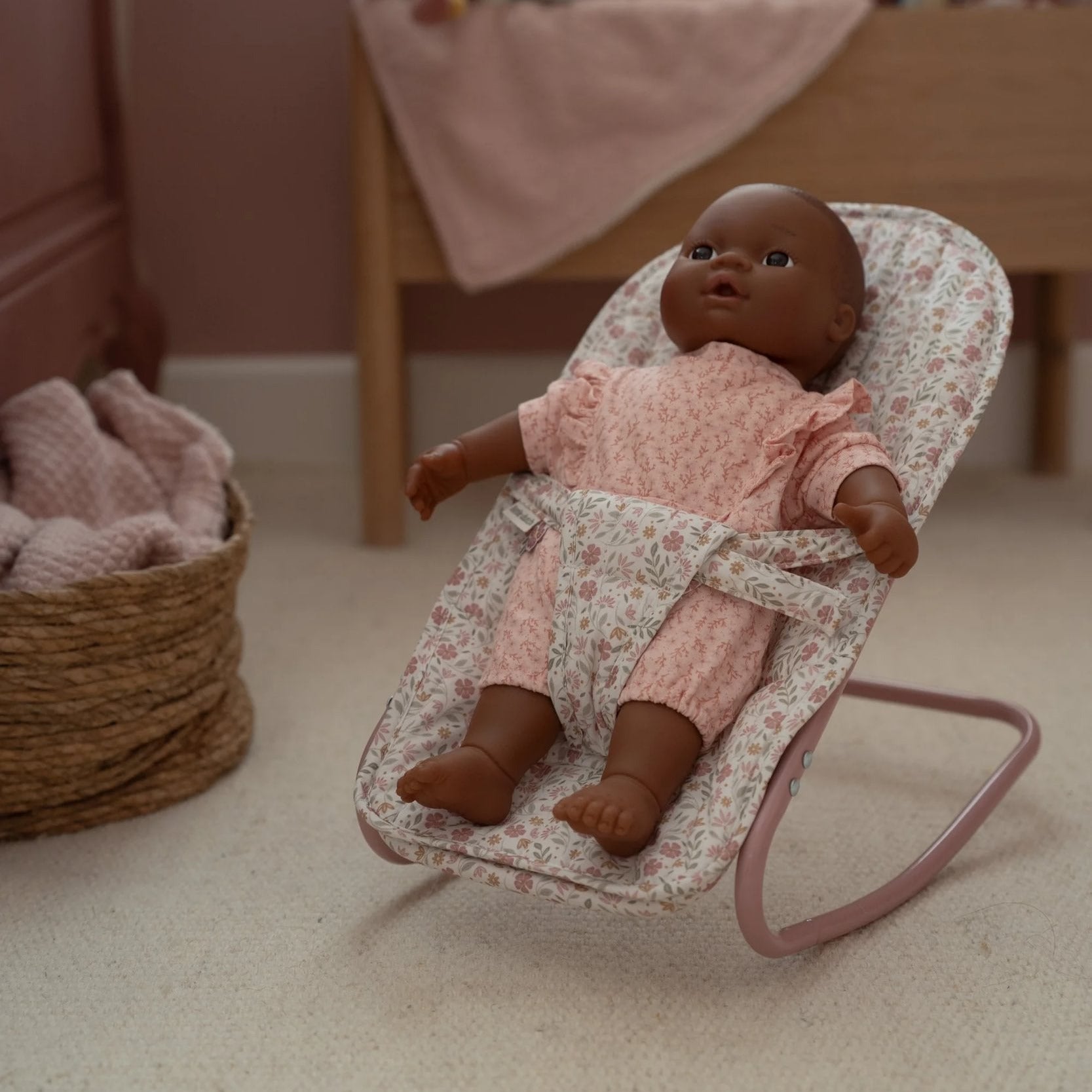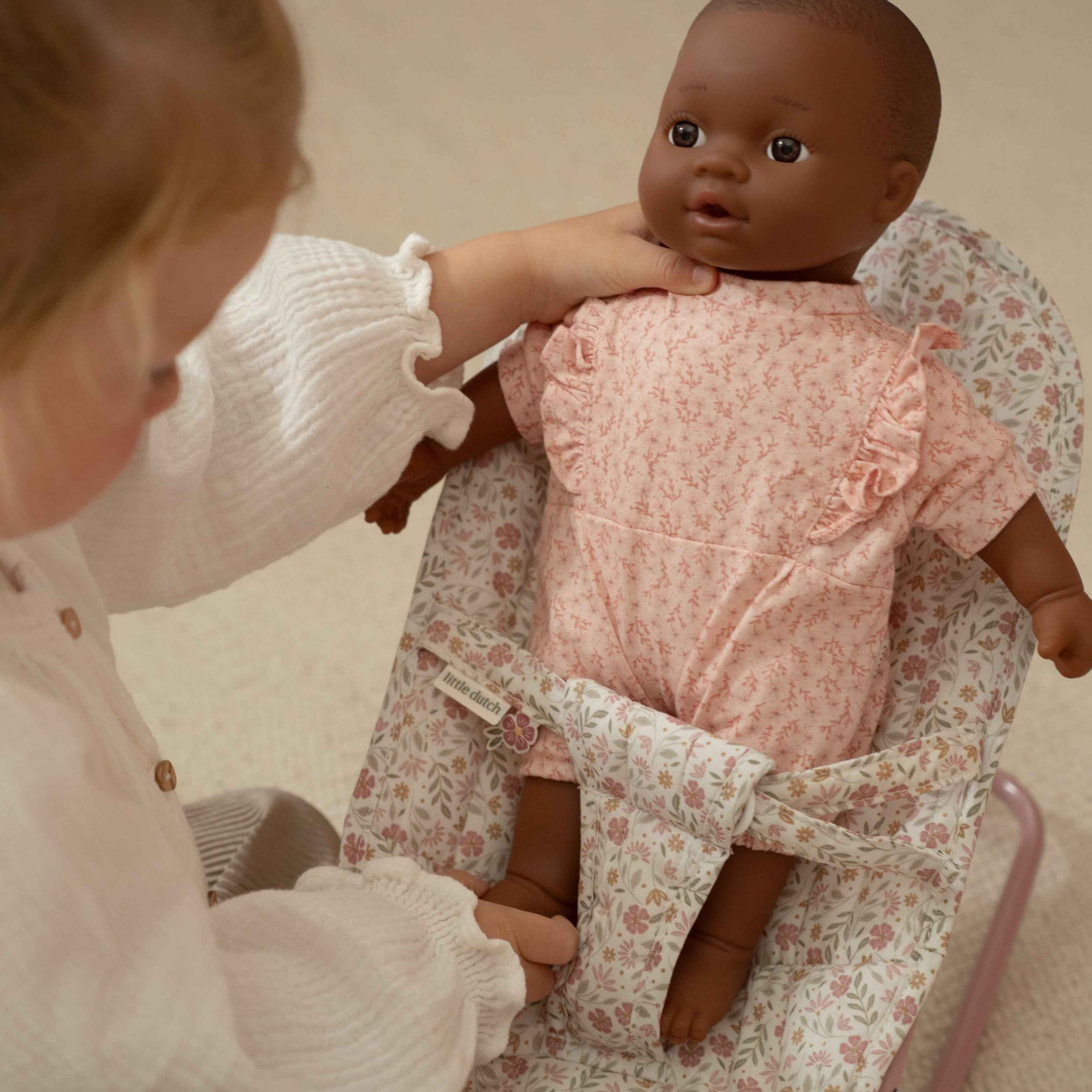 Die Liege begeistert mit dem zarten, pastellfarbenen Muster Soft Flowers, das eine ruhige, angenehme Atmosphäre ins Spiel bringt. Die leichte Metallkonstruktion macht sie einfach transportierbar, und der integrierte Sicherheitsgurt sorgt dafür, dass die Puppe sicher liegt. Ein wunderschönes, funktionales Accessoire, das ideal mit anderen Spielzeugen der Little Dutch Kollektion harmoniert.