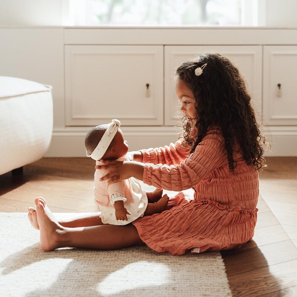 Babys lieben es, alles nachzuahmen, was ihre Eltern tun, und diese Babypuppe wird Ihr Kind dazu inspirieren, sich an der Pflege zu beteiligen. Noa trägt ein Haarband, ein gemustertes Kleid und eine Hose von White Meadows sowie eine hellrosa Weste. Das Wechseln der Kleidung fördert die Feinmotorik, während der Schnuller und die Milchflasche Teil des interaktiven Spiels sind.