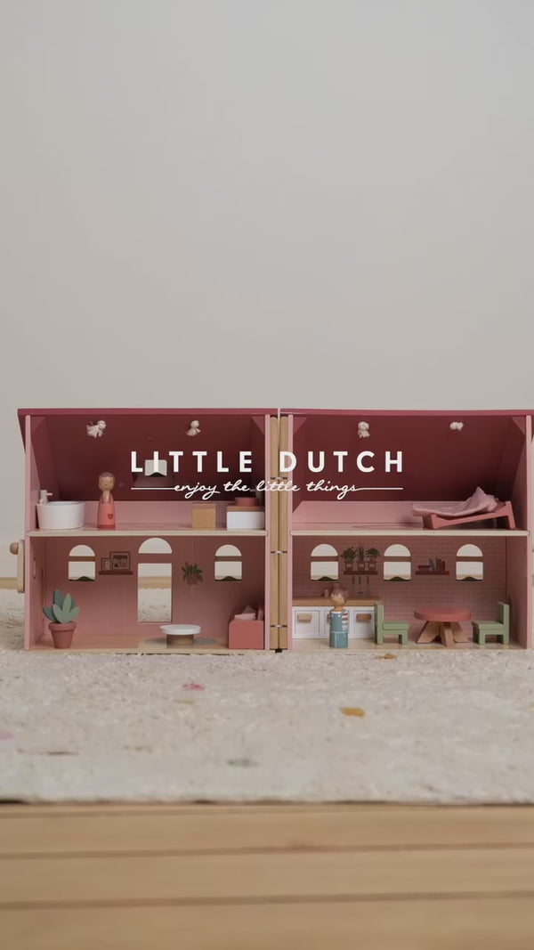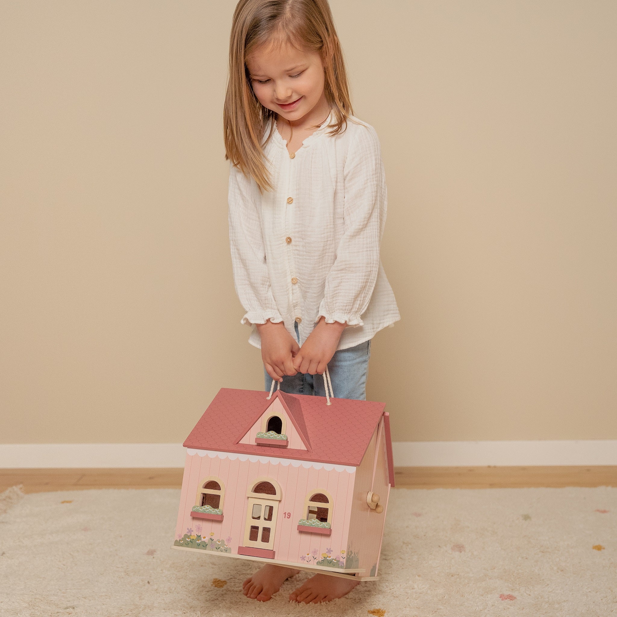 Das tragbare Holzhaus ist bezaubernd und sehr sorgfältig gefertigt, mit schönen Details. Das Puppenhaus ist auf zwei Ebenen unterhaltsam: Im Erdgeschoss befinden sich das Wohnzimmer und die Küche, während im ersten Stock ein Schlafzimmer und ein Badezimmer untergebracht sind. Dank des Holzverschlusses lässt sich das Haus ganz einfach öffnen und schließen, und der Griff am Dach macht es leicht, es von einem Ort zum anderen zu bewegen. Dank seiner kompakten Größe passt dieses Häuschen problemlos in jedes Kinderzimmer. Die gesamte notwendige Ausstattung, einschließlich Möbel und zwei Spielfiguren aus Holz , ist im Lieferumfang enthalten.
