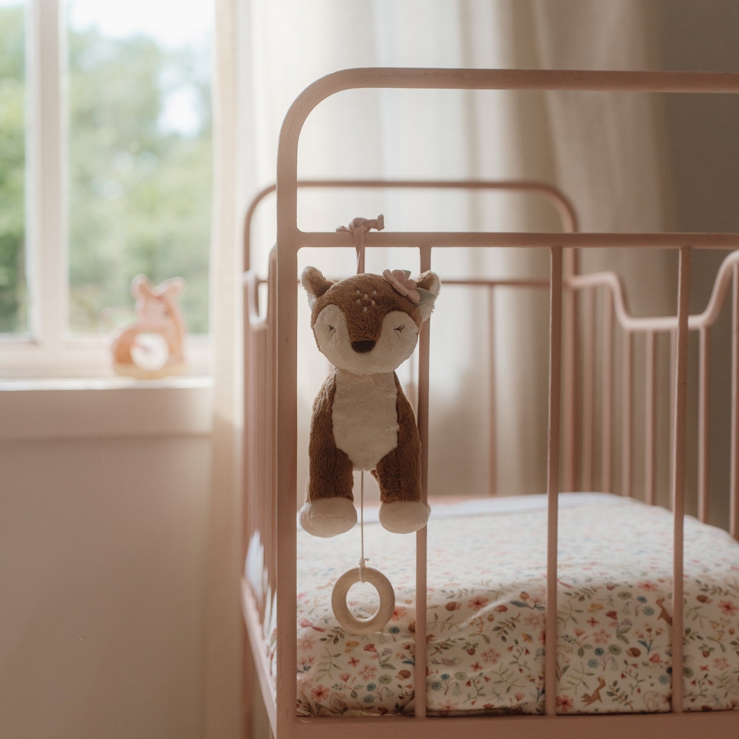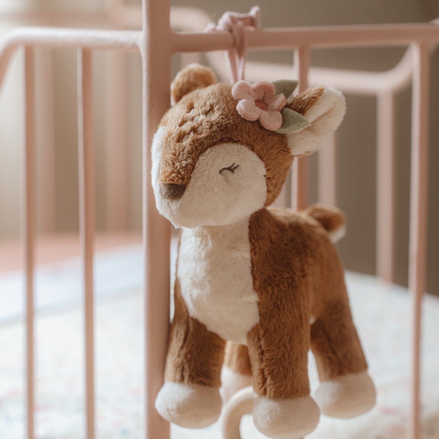 Die niedliche schlafende Rehe hilft Ihrem Kind, sich zu beruhigen, zu entspannen und dadurch leichter einzuschlafen. Ziehen Sie einfach leicht an dem Holzring, und die Spieluhr spielt eine schöne Schlafmelodie. Mit einem Anhänger aus Schnur lässt sie sich leicht am Bettchen oder Autositz befestigen.