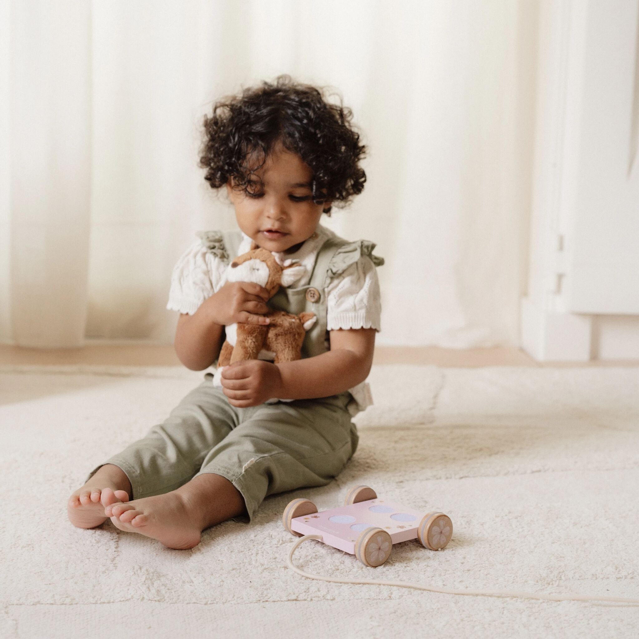 Willkommen in der zauberhaften Welt von Fairy Garden! Das Rehkitz mit Rädern von Little Dutch ist eine weiche, kuschelige Gefährtin, die Ihr Kind gerne auf eine märchenhafte Abenteuerreise begleitet. Einfach an der Schnur ziehen – und das niedliche Reh rollt auf seinem mit Blumen verzierten Holzwägelchen über den Boden. Das Spielzeug animiert zur Bewegung und unterstützt das Laufenlernen, wobei es gleichzeitig die Koordination und das Gleichgewicht fördert.