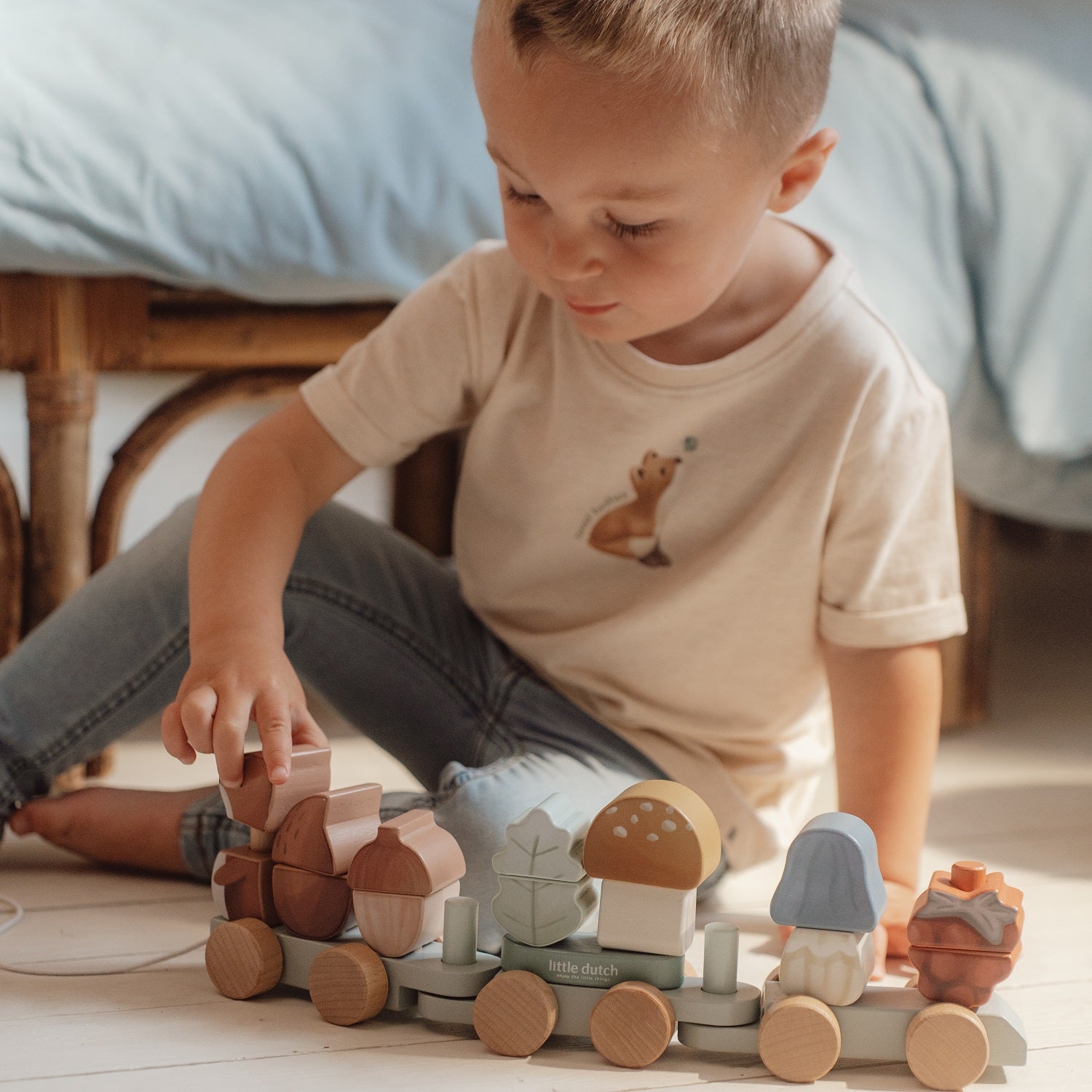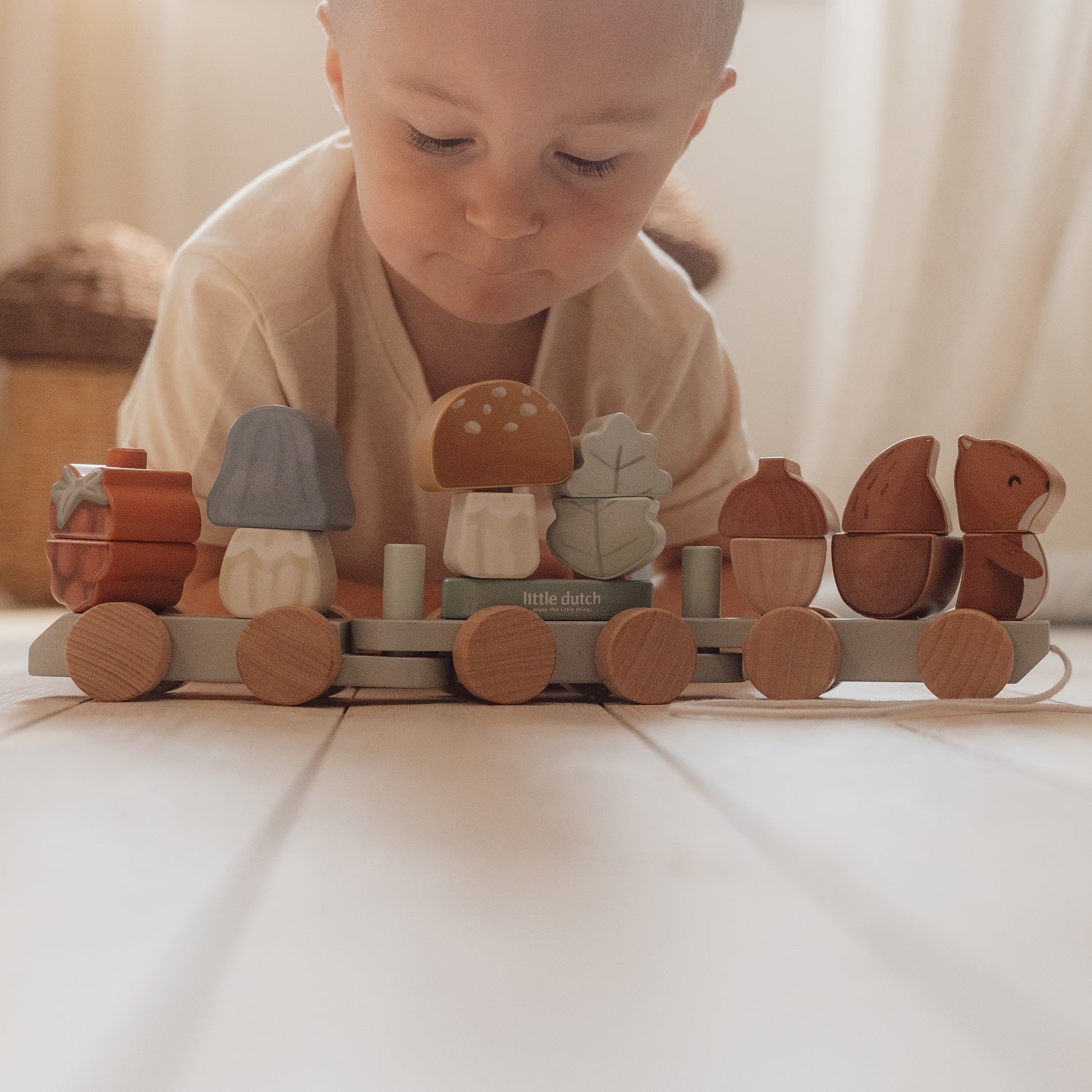 Forest Friends FSC Eichhörnchen Zug-Zug von Little Dutch. Ein Holzzug mit niedlichen Blöcken mit Waldschätzen und einem Eichhörnchen an der Spitze der Forest Friends Kollektion. Bis zu drei Waggons können die Blöcke nach Wunsch nach Ihrer Phantasie angeordnet werden.