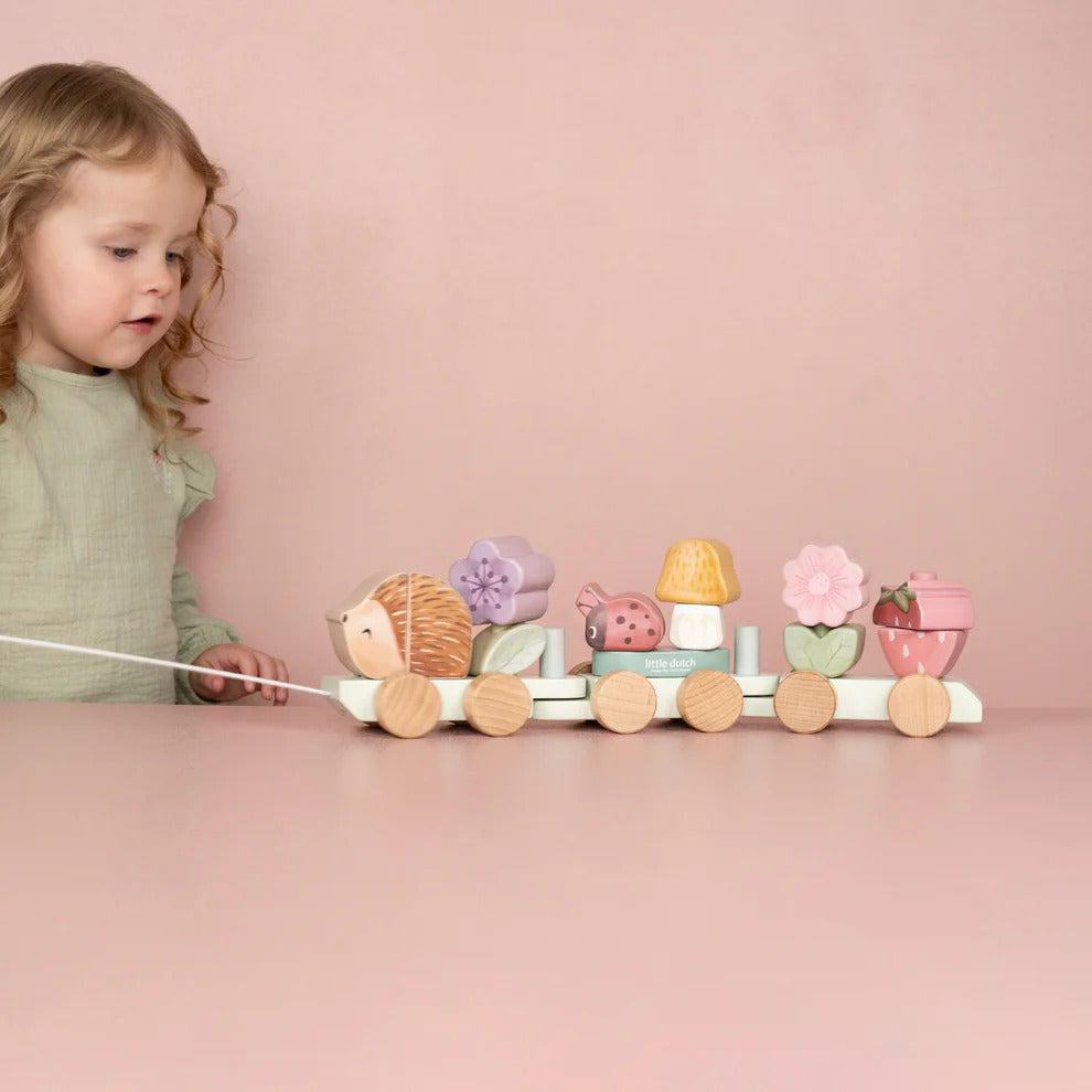 Fairy Garden Hedgehog Train Puzzle FSC von Little Dutch Ein Holzzug mit niedlichen Blöcken mit Tieren und Pflanzen aus dem Feenwald und dem Igel an der Spitze der Fairy Garden Kollektion. Mit bis zu drei Waggons lassen sich die Blöcke nach Belieben und Fantasie anordnen.