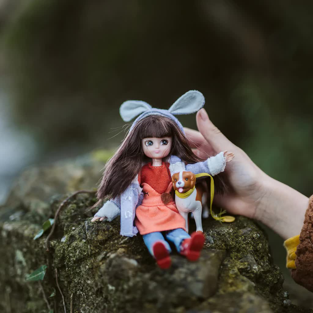 Lottie Doll liebt den Herbst. Dann macht sie lange Spaziergänge mit ihrem Hund und bewundert die Herbstfarben. Sie trägt einen hübschen Mantel, eine Bluse mit Fuchsmuster, Schuhe und Jeans.
