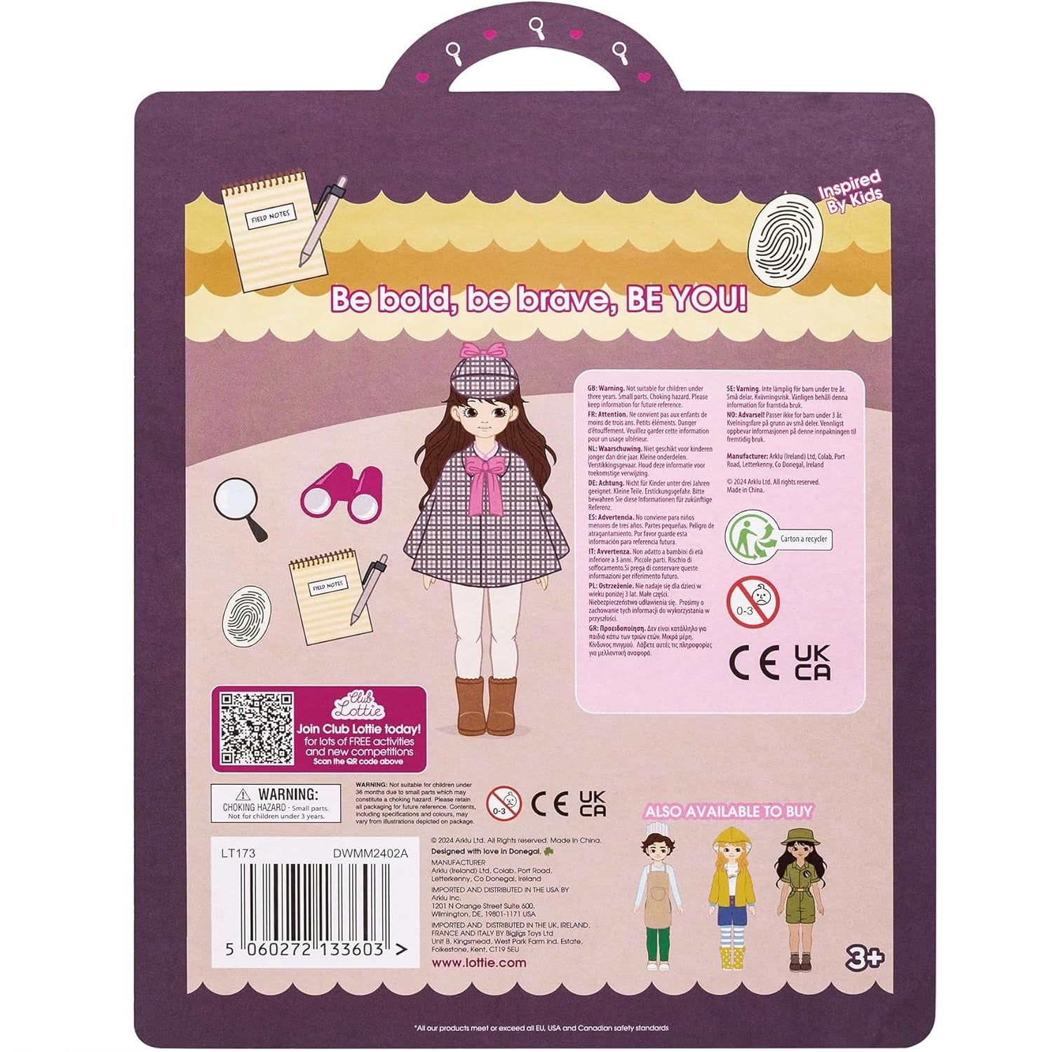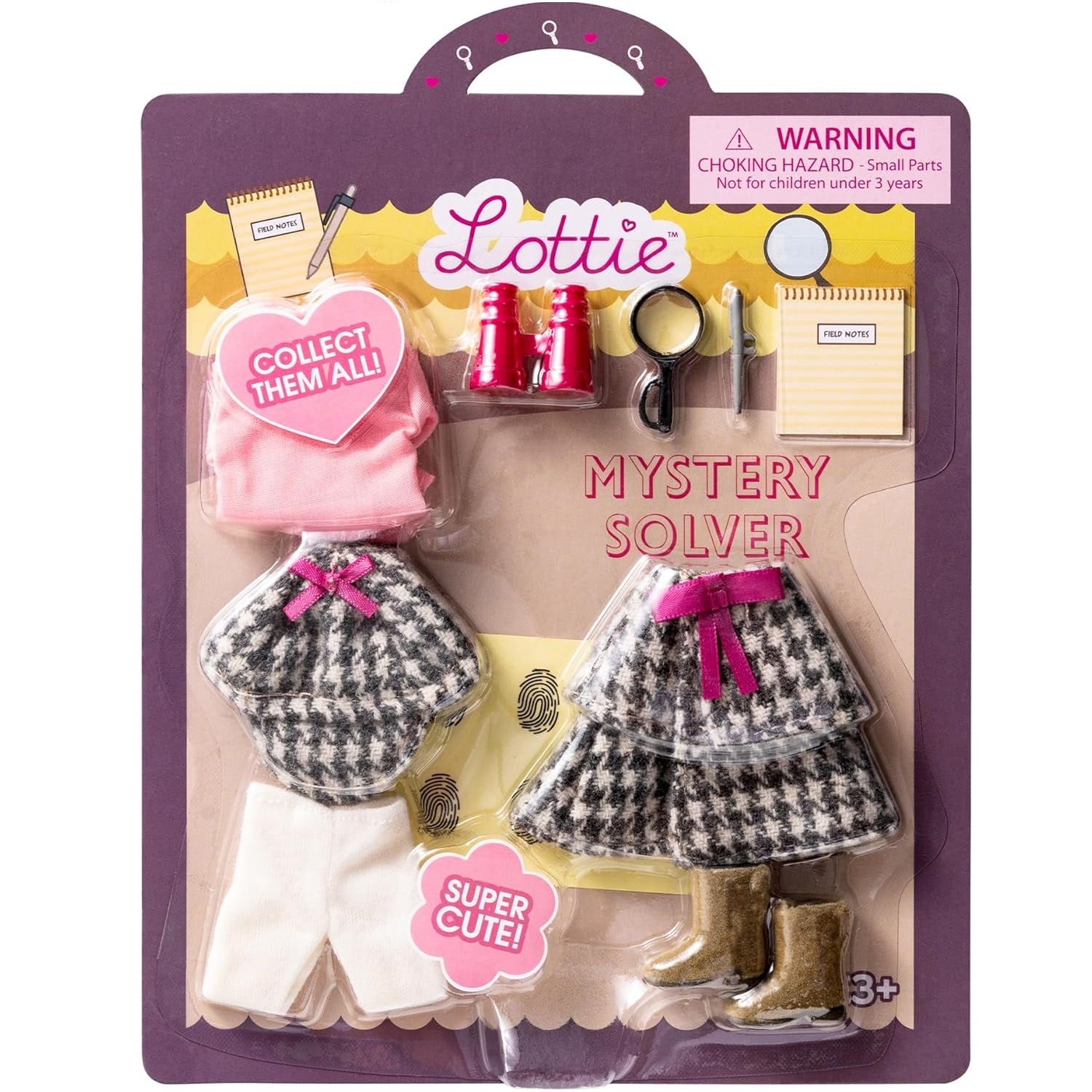 Lottie und ihre Freunde lieben es, sich in einzigartige Kostüme zu verkleiden. Suche nach Hinweisen in Form von Aufklebern und löse das Rätsel mit Hilfe eines praktischen Notizbuchs und eines Kugelschreibers. Werde ein echter Detektiv! Das Set enthält: einen Pepita-Umhang und einen Hut mit rosa Schleifen, ein rosa Baumwolltop und eine cremefarbene Hose, braune Flockstiefel, ein Notizbuch und einen Stift, ein rosa Fernglas, eine schwarze Lupe und Aufkleber mit Hinweisen.
