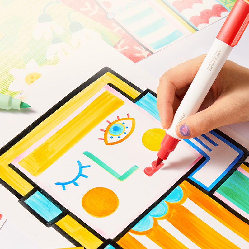 Die dünnere Spitze erleichtert das Zeichnen von Details, die breitere Spitze scheut sich nicht vor kräftigen Strichen. Die dreieckige, ergonomische Form ist so konzipiert, dass sie auch bei langen Malsitzungen bequem in der Hand liegt. Dieses Set ist ideal für alle, die Wert auf Sauberkeit legen, denn Marker, die außerhalb des Blattes landen, lassen sich ganz leicht abwaschen. Halten Sie die Kreativität Ihrer Kinder nicht zurück, lassen Sie sie ein- oder zweimal über die Linien hinausgehen! Und den Rest räumen sie selbst auf.