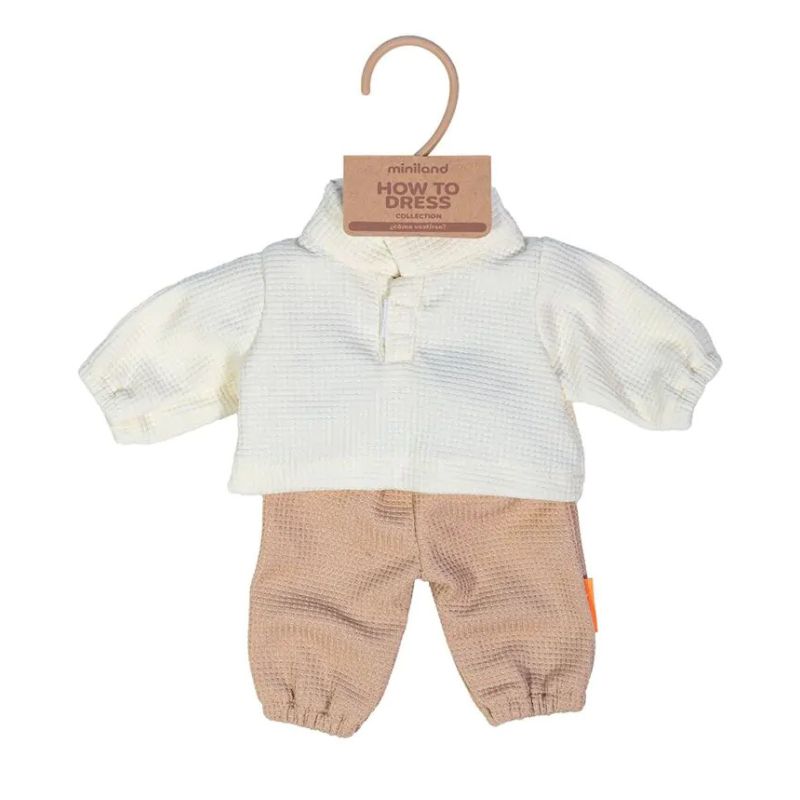 Kleiden Sie Ihre Miniland-Puppe in ein bezauberndes Set, perfekt für Sommertage. Die 38 cm große Mini-Garderobe wird durch ein süßes Outfit bestehend aus einer beigen Hose und einem cremefarbenen Oberteil ergänzt. Das handgenähte Set wird an Ihrer Puppe wunderschön aussehen, und das Spielen mit dem An- und Ausziehen ist eine tolle Übung für die Feinmotorik Ihres Kindes.
